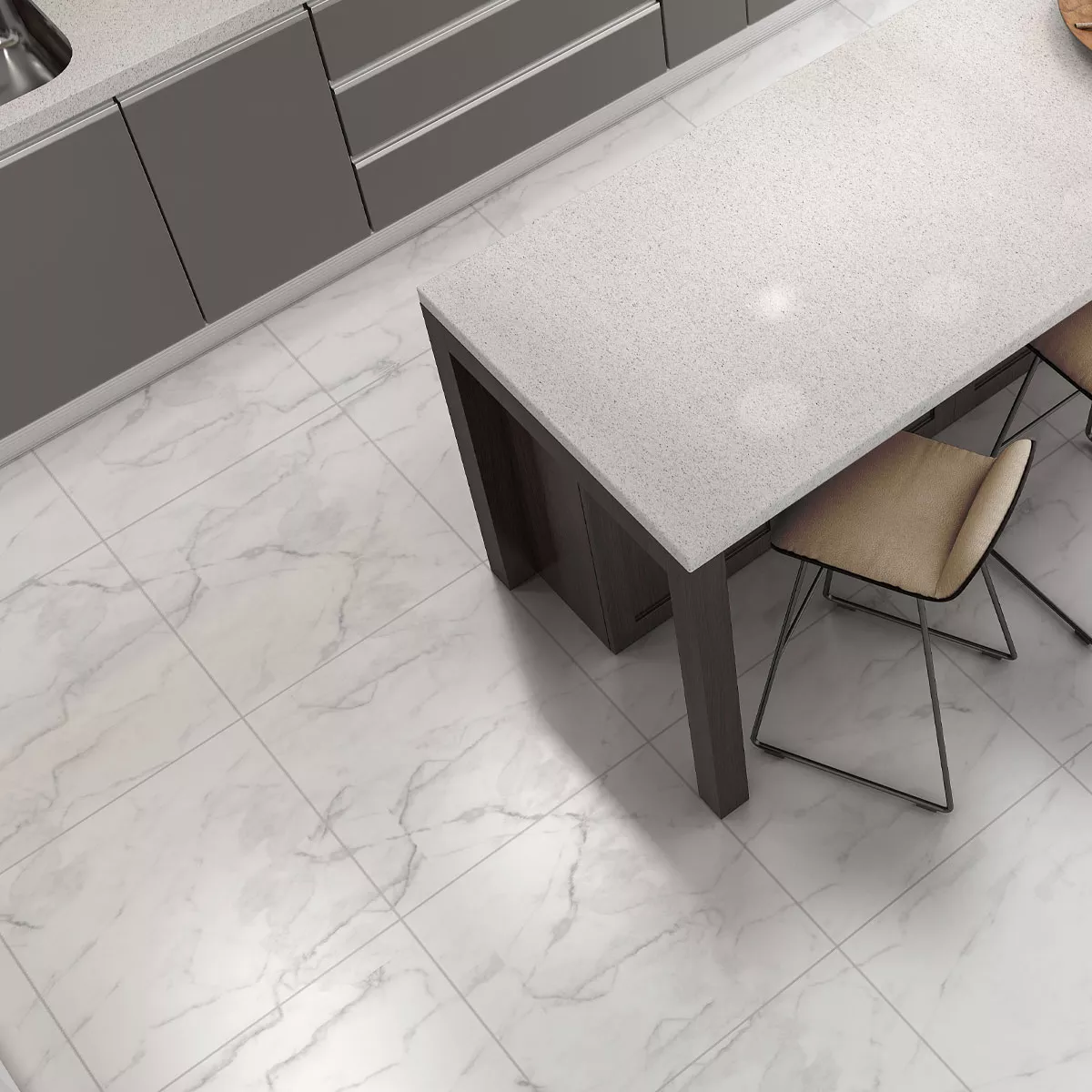 Die Bodenfliesen "Arcadia Marmoroptik Matt" bringen zeitlose Eleganz in Ihren Innenraum. Mit einer Größe von 60x60cm, einer Stärke von 6mm und einer matten, marmoroptischen Oberfläche verleihen sie Ihrem Wohnraum, Ihrer Küche, Ihrem Bad und Ihrer Dusche eine luxuriöse Atmosphäre. Die rechteckige Form und die Farbgebung in Weiß Grau schaffen eine harmonische Ästhetik. Hergestellt aus Feinsteinzeug, sind diese Fliesen nicht nur für den Innenbereich, sondern auch für Nassbereiche geeignet.