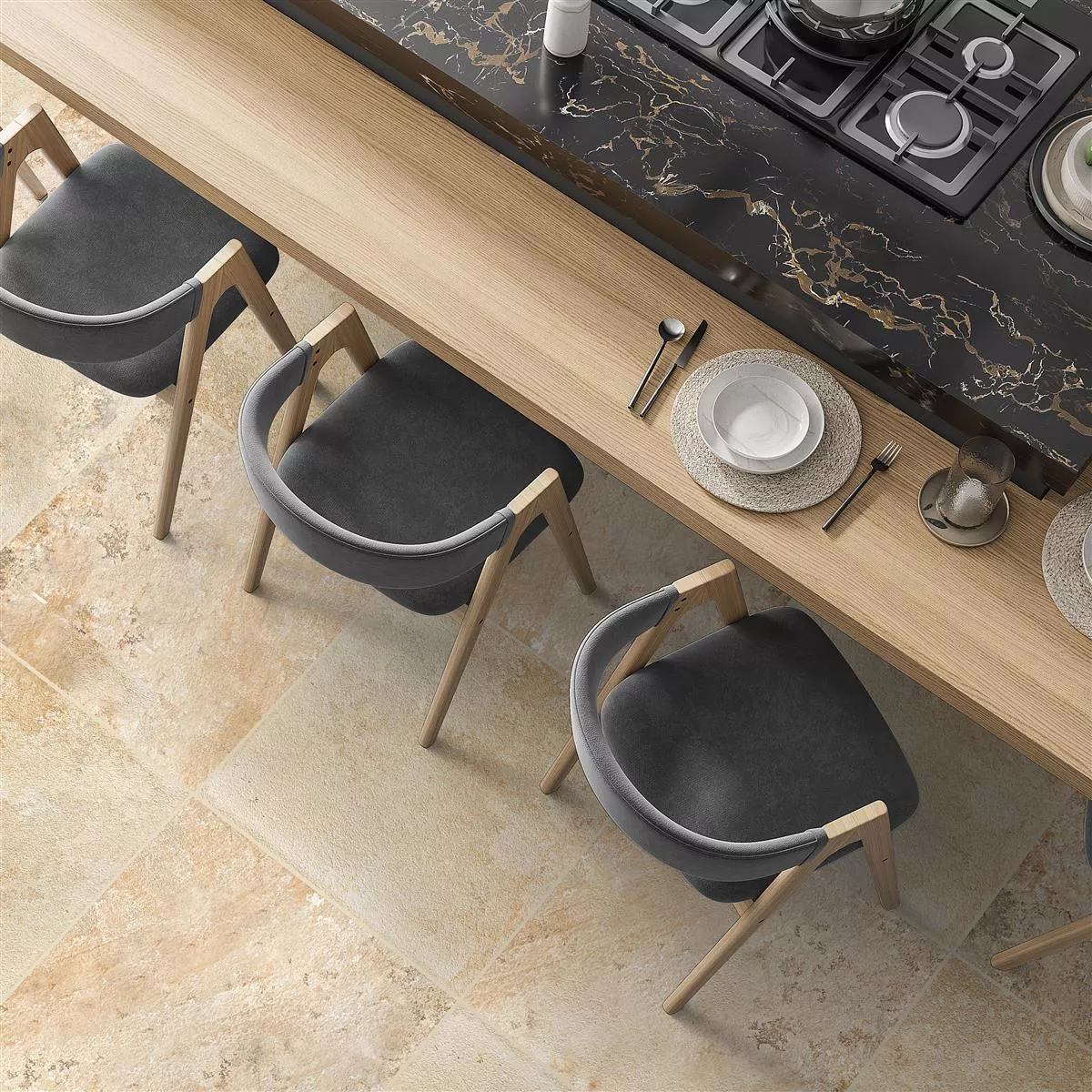 Die Fliesen imitieren die natürliche Travertinoptik und verleihen Ihren Räumen einen Hauch von mediterranem Flair.