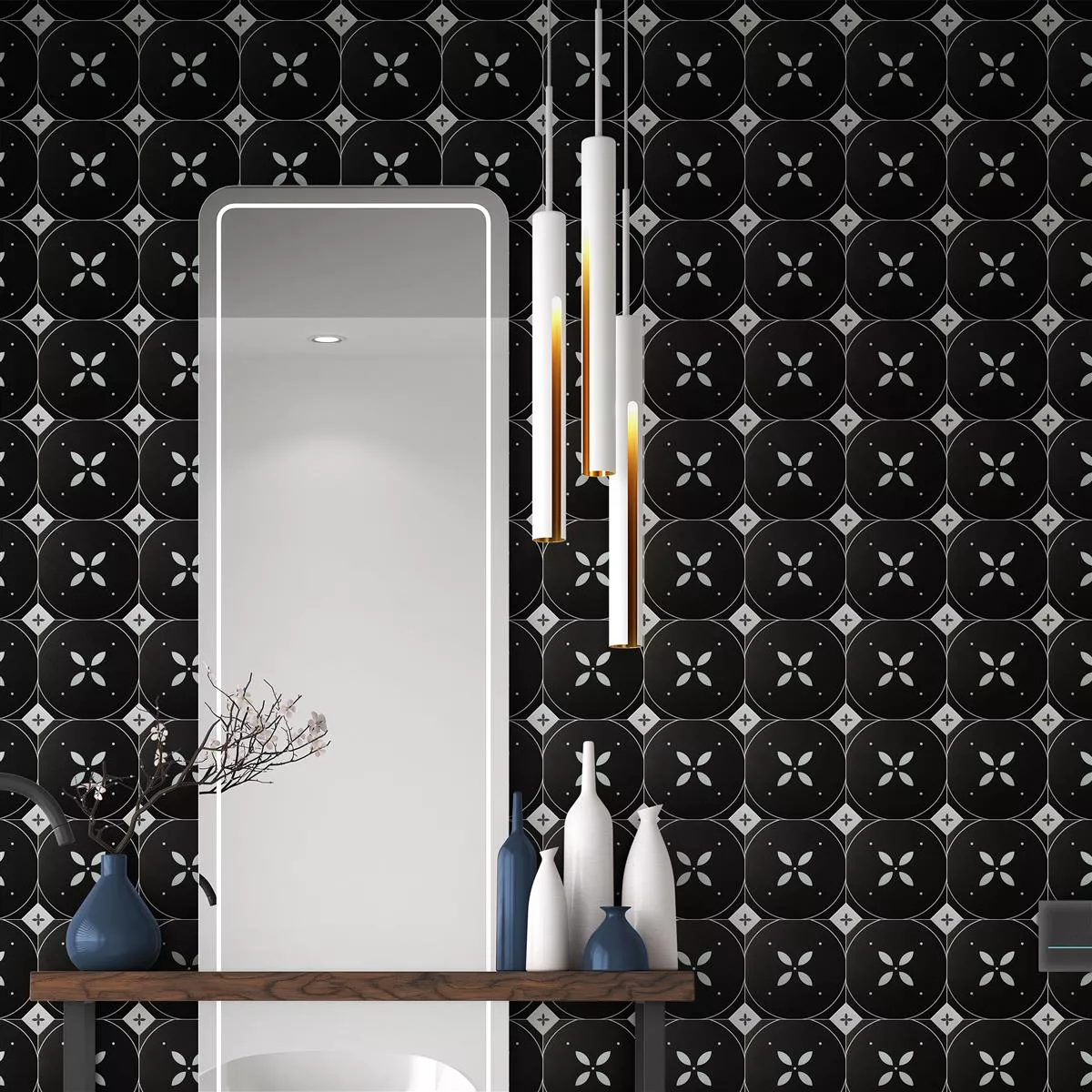 Die Feinsteinzeug Fliesen Genexia Schwarz Weiß Decor 1 Einleger bringen zeitlose Eleganz in jedes Interieur. Das quadratische Format mit einer matten Oberfläche eignet sich sowohl für Wände als auch für Böden, und ihr dekoratives Schwarz-Weiß-Design verleiht Ihren Räumen eine besondere Note.