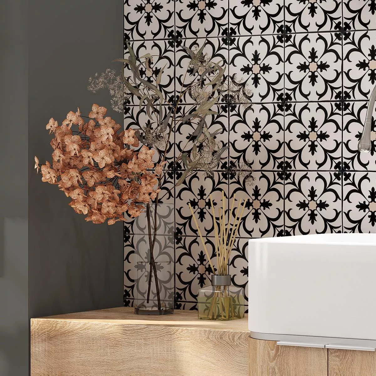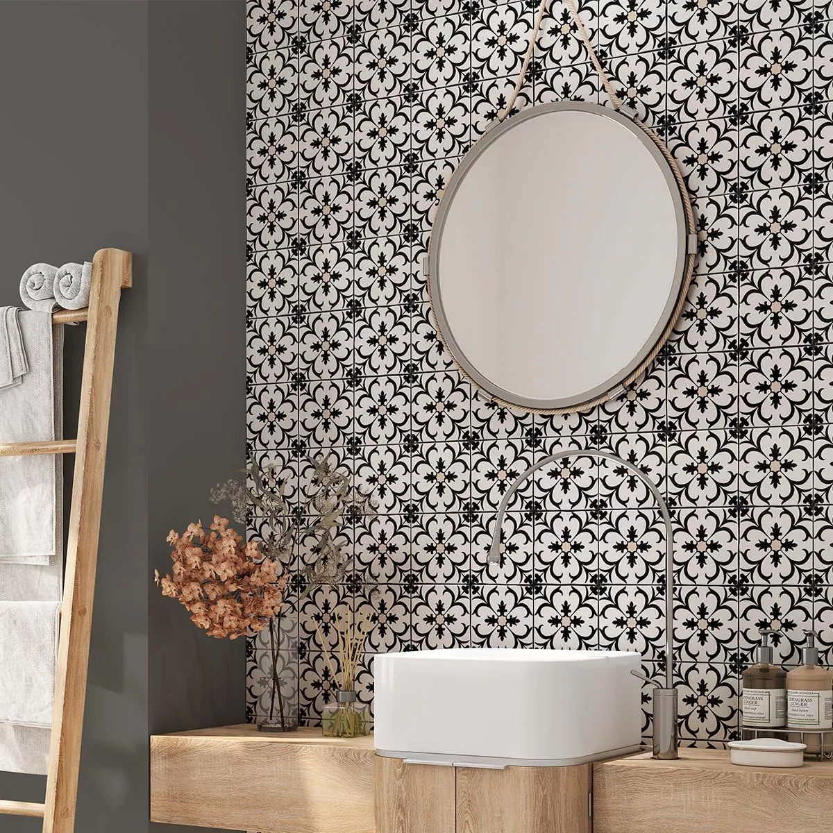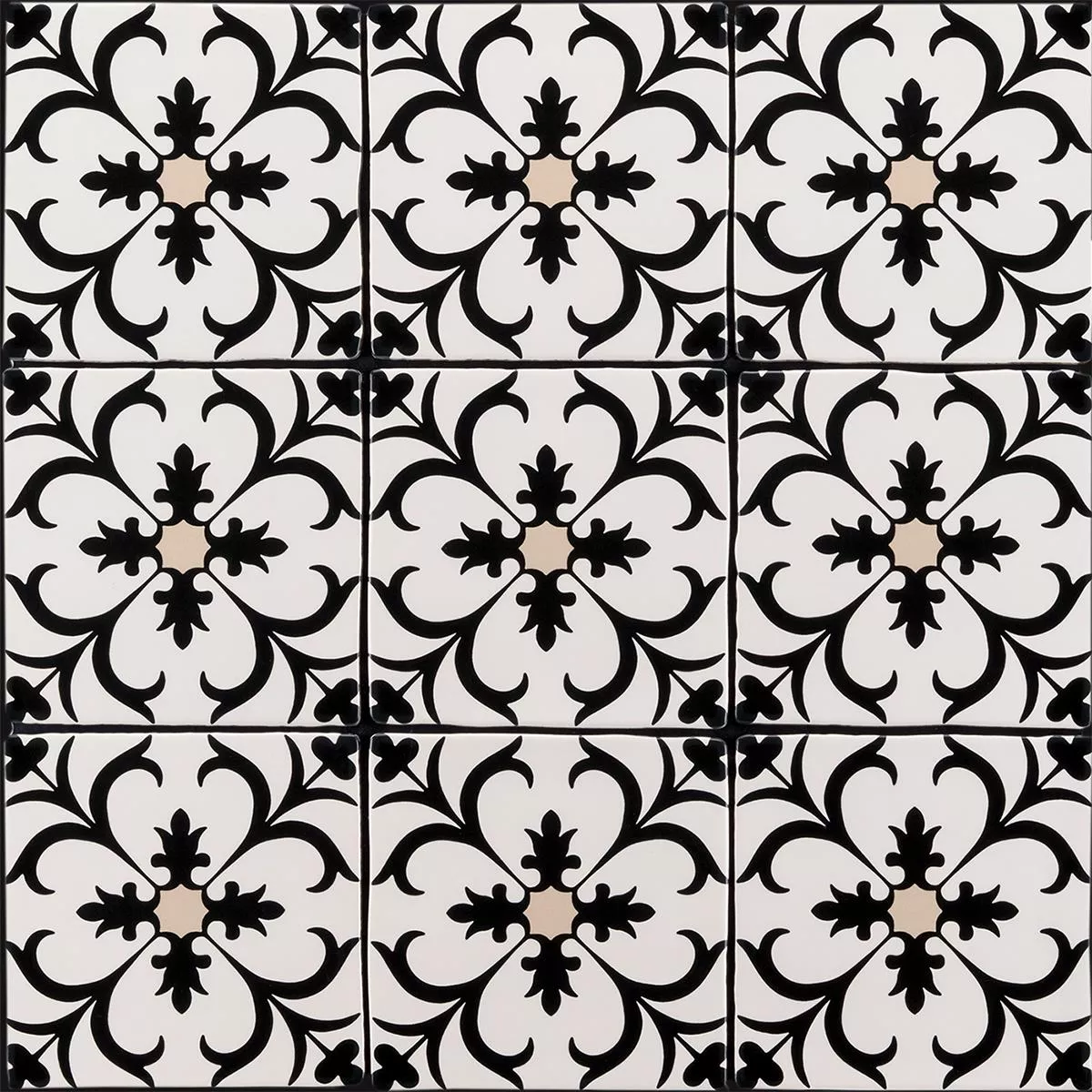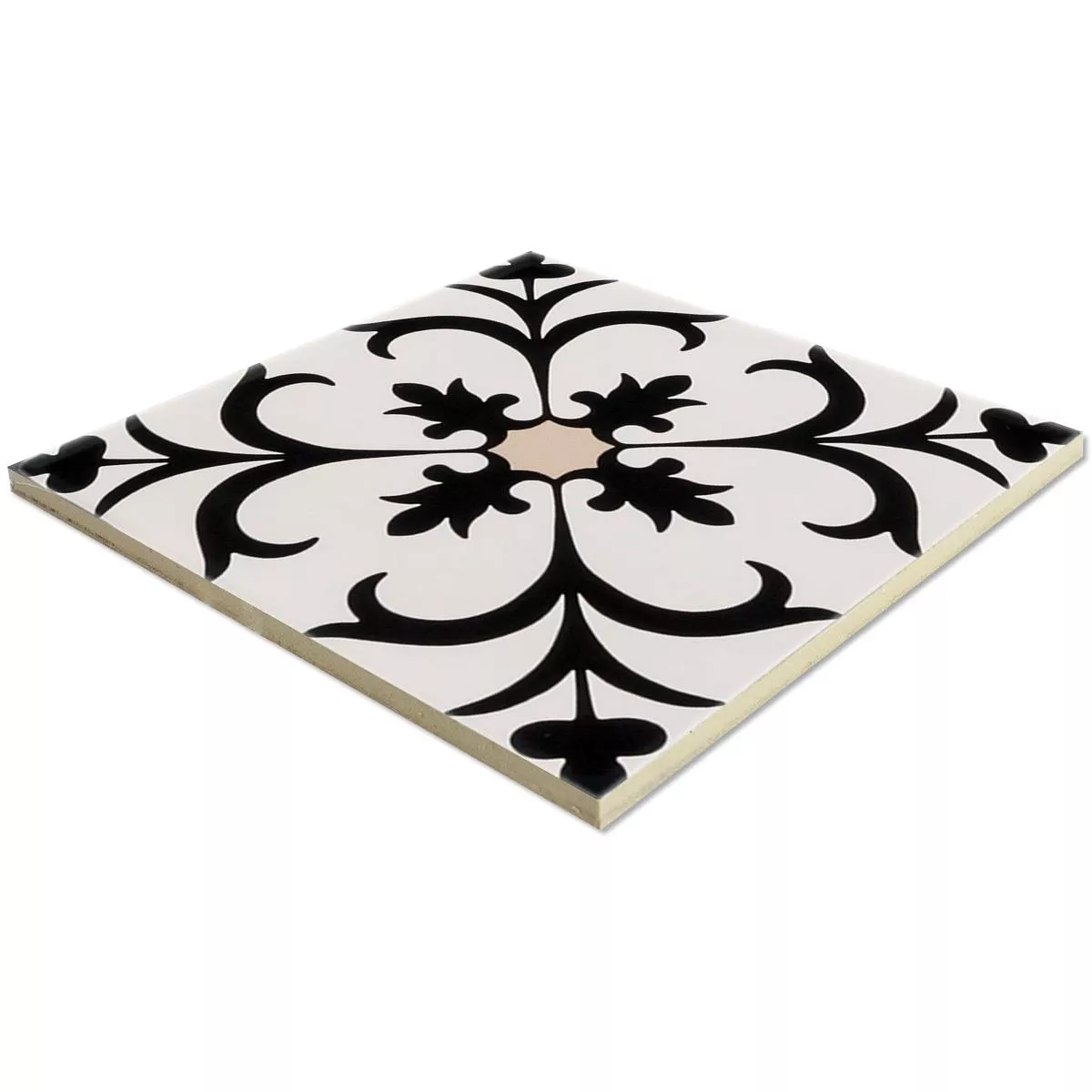 Die Bodenfliesen Ornamenti Trieste in Blumenoptik verleihen Ihrem Innenbereich eine harmonische Mischung aus Schwarz, Beige und Weiß. Die matte Oberfläche und eine Stärke von 8mm verleihen ihnen eine robuste Struktur.