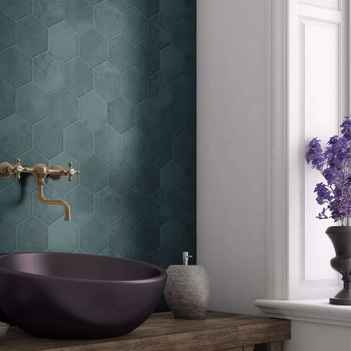 Die Palencia Grün Hexagon Fliesen vereinen Sicherheit und Stil. Die R12-Rutschhemmung gewährleistet optimalen Halt in Nassbereichen, während das ansprechende grüne Design in verschiedenen Variationen Ihrem Raum eine natürliche, lebendige Atmosphäre verleiht.