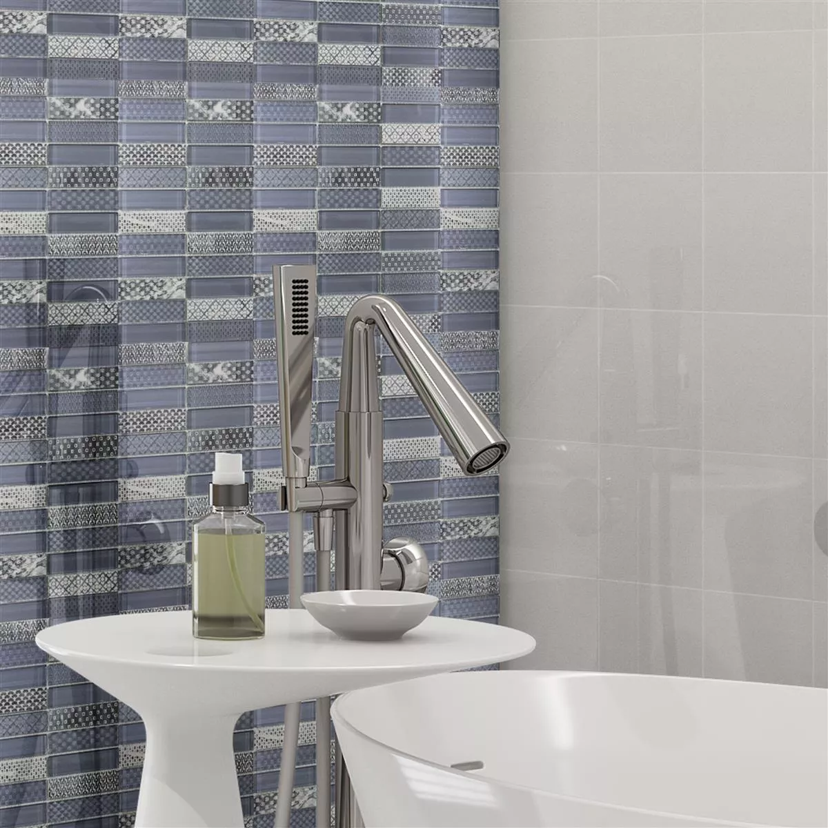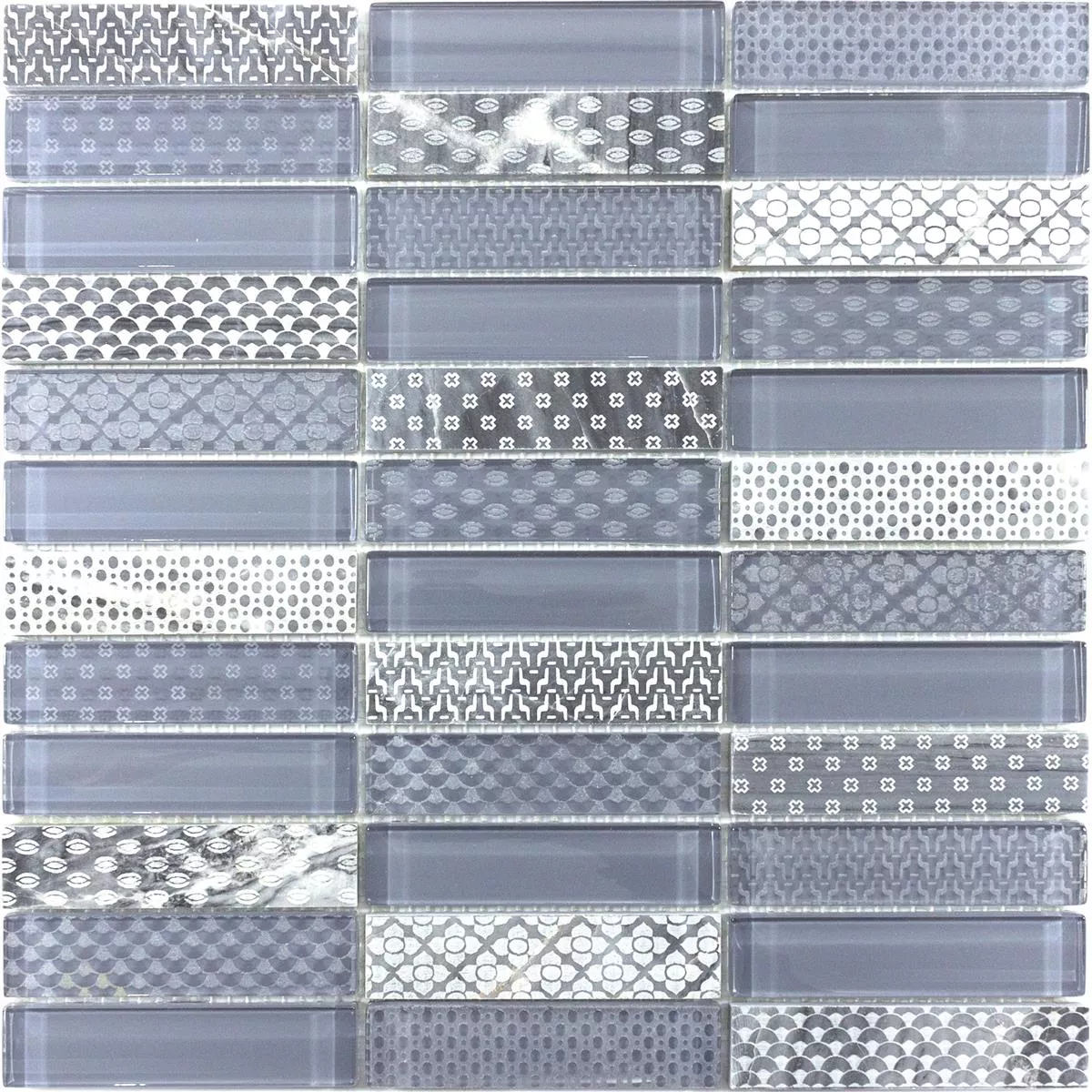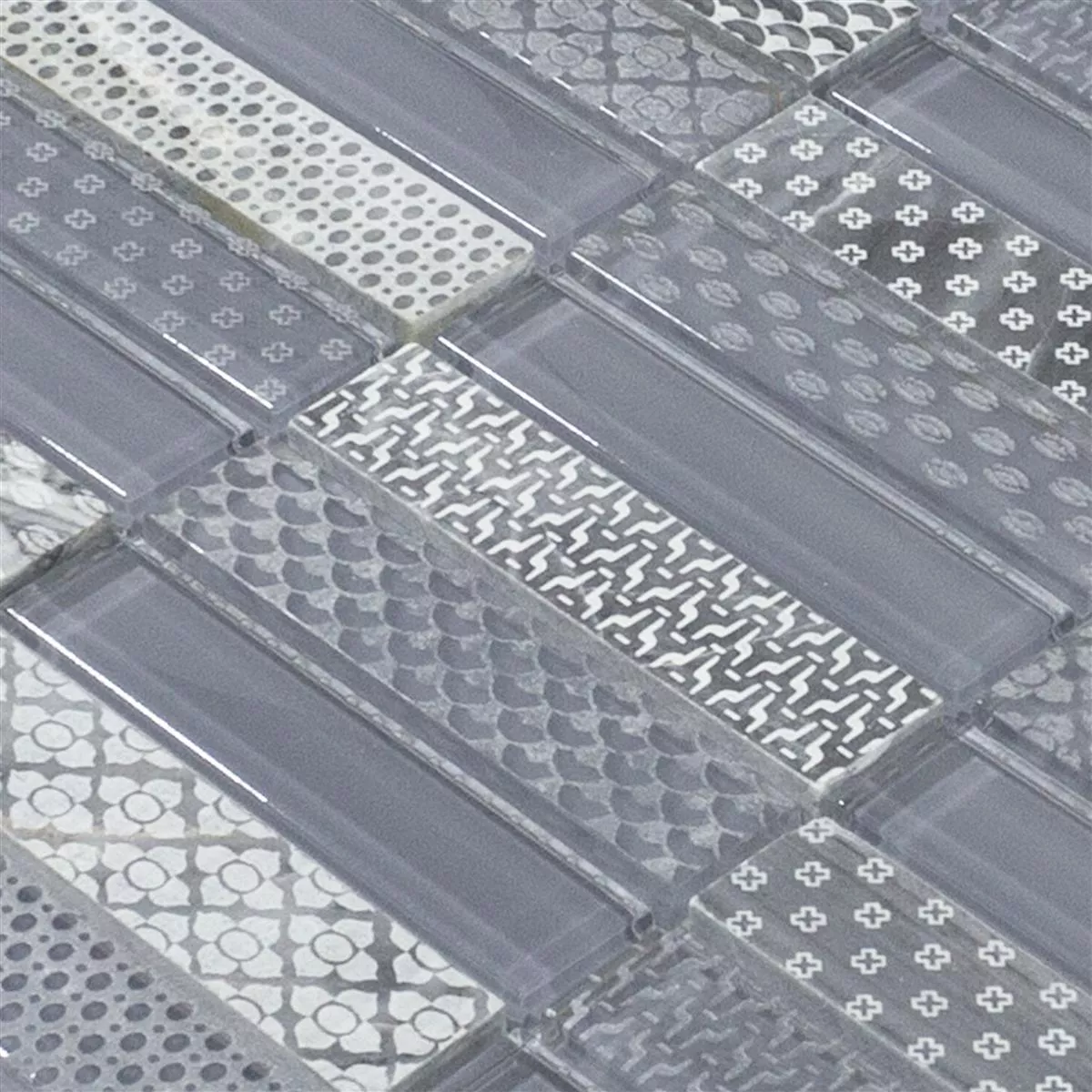 Glas Naturstein Mosaik Fliesen Celestiana Ornament Brick Mix – Ästhetik in Grau.
