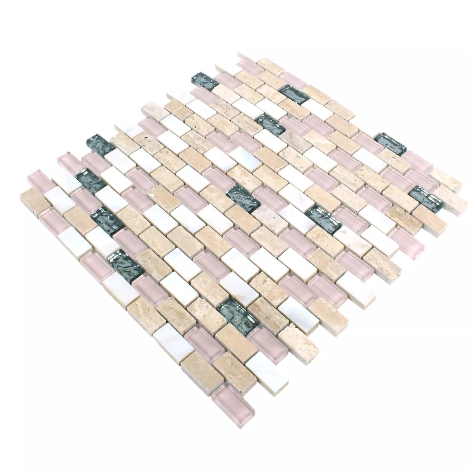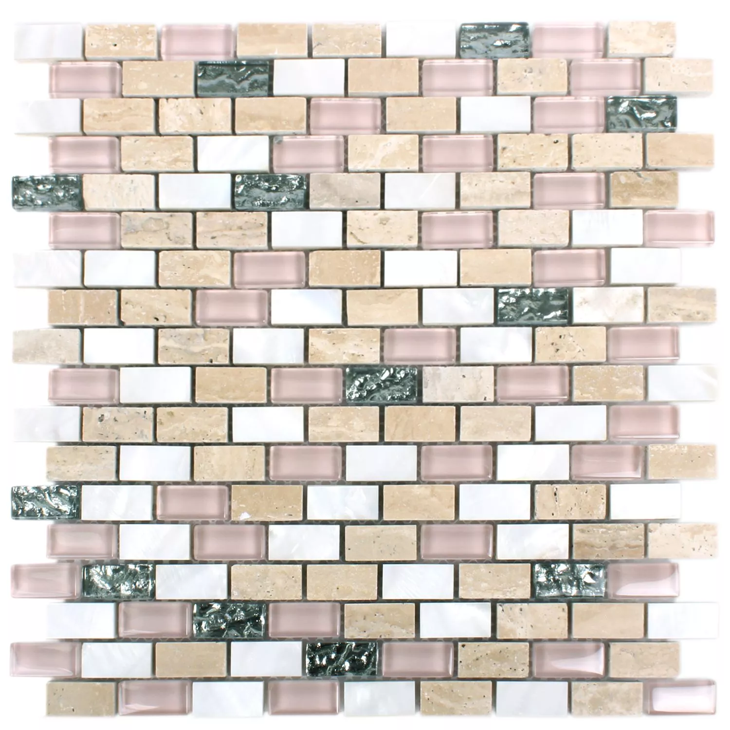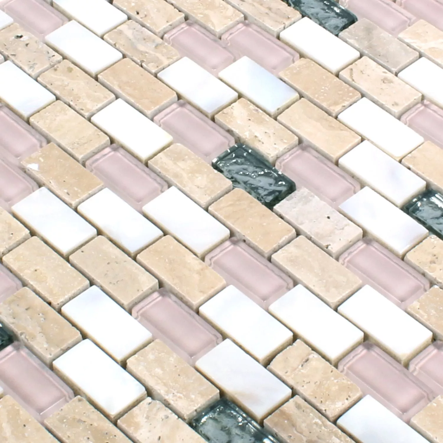 Diese Natursteinfliesen sind in weiss und beige-rosa verfügbar. Bei der Verlegung dieser Natursteinfliesen entsteht über das unregelmäßig Glasmosaik, ein besonders eindrucksvolles und edles Flair. Diese Wandfliesen sind als Badfliesen einfach die erste Wahl. Die Wandfliesen lassen sich schnell und sicher verlegen, denn das Matten-System des Glasmosaik ermöglicht großflächiges Arbeiten. Als Wandfliesen bietet dieses Produkt die optimale Art, schnell und sehr präzise den Wandbelag zu erzeugen. Die Mosaikfliesen dieser Art, zeichnen sich auch durch ihre Robustheit und Haltbarkeit aus. Es sind Natursteinfliesen die als Mosaikfliesen, sich besonders als Badfliesen eignen.