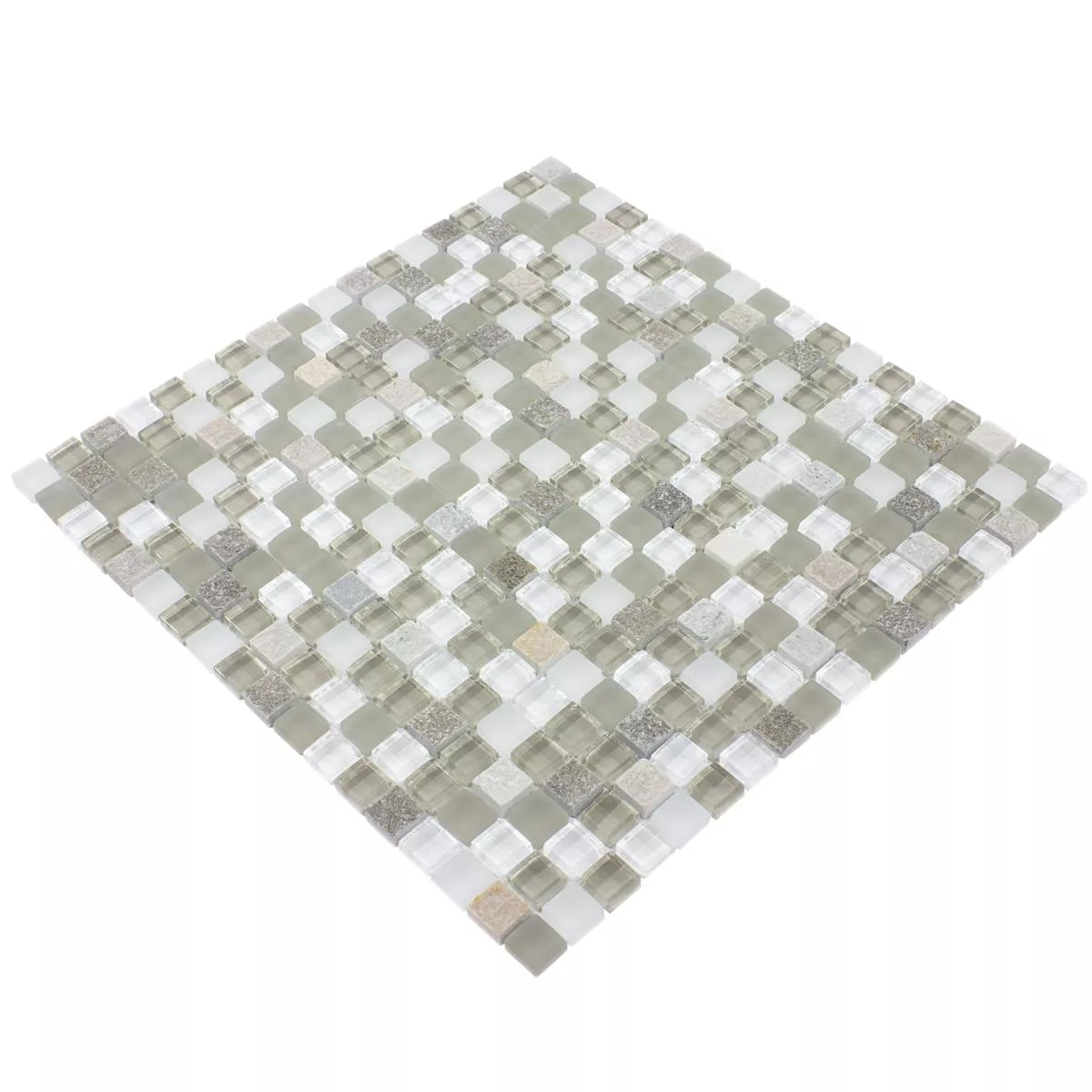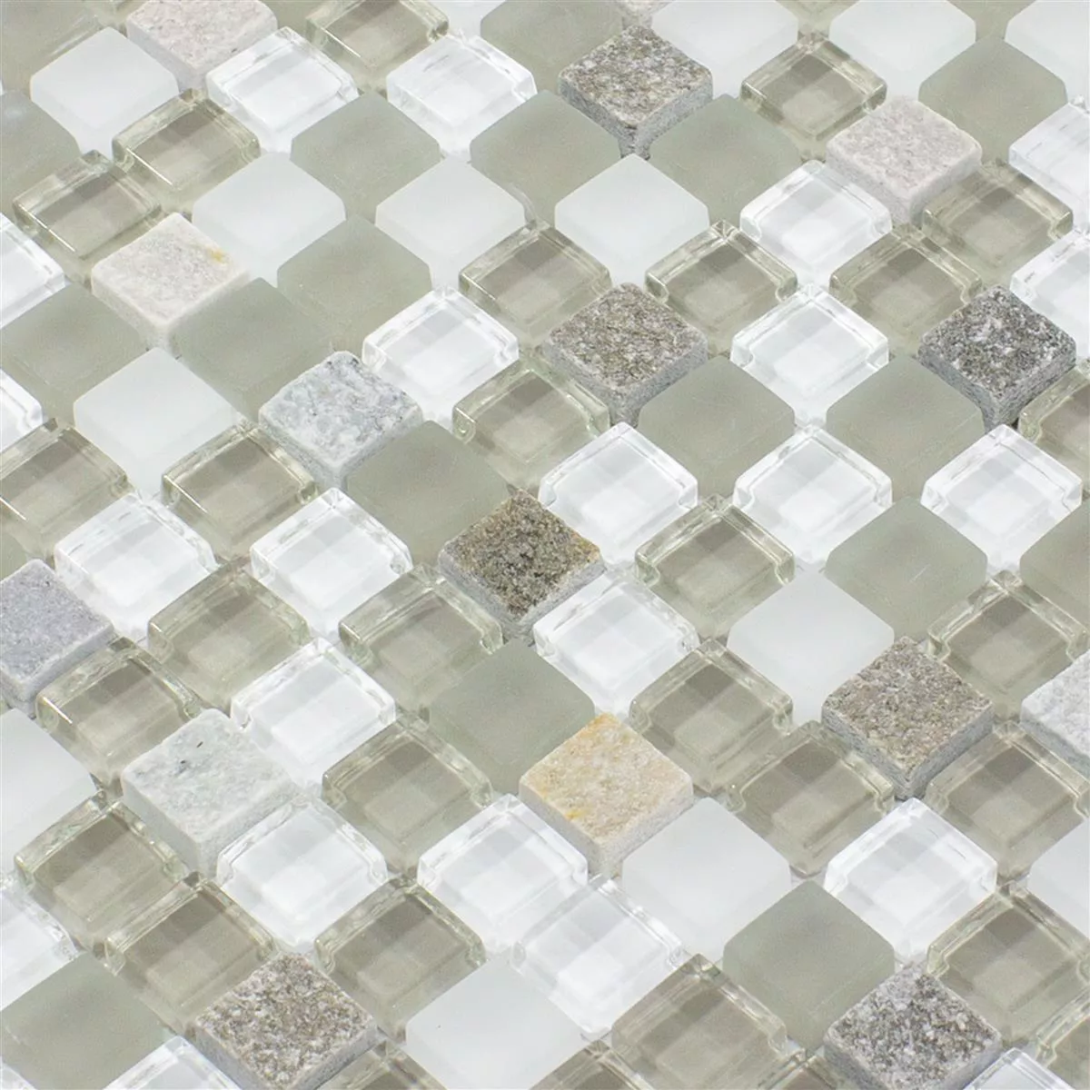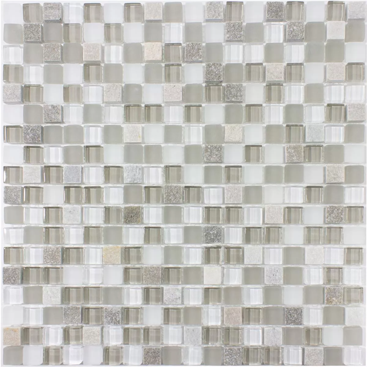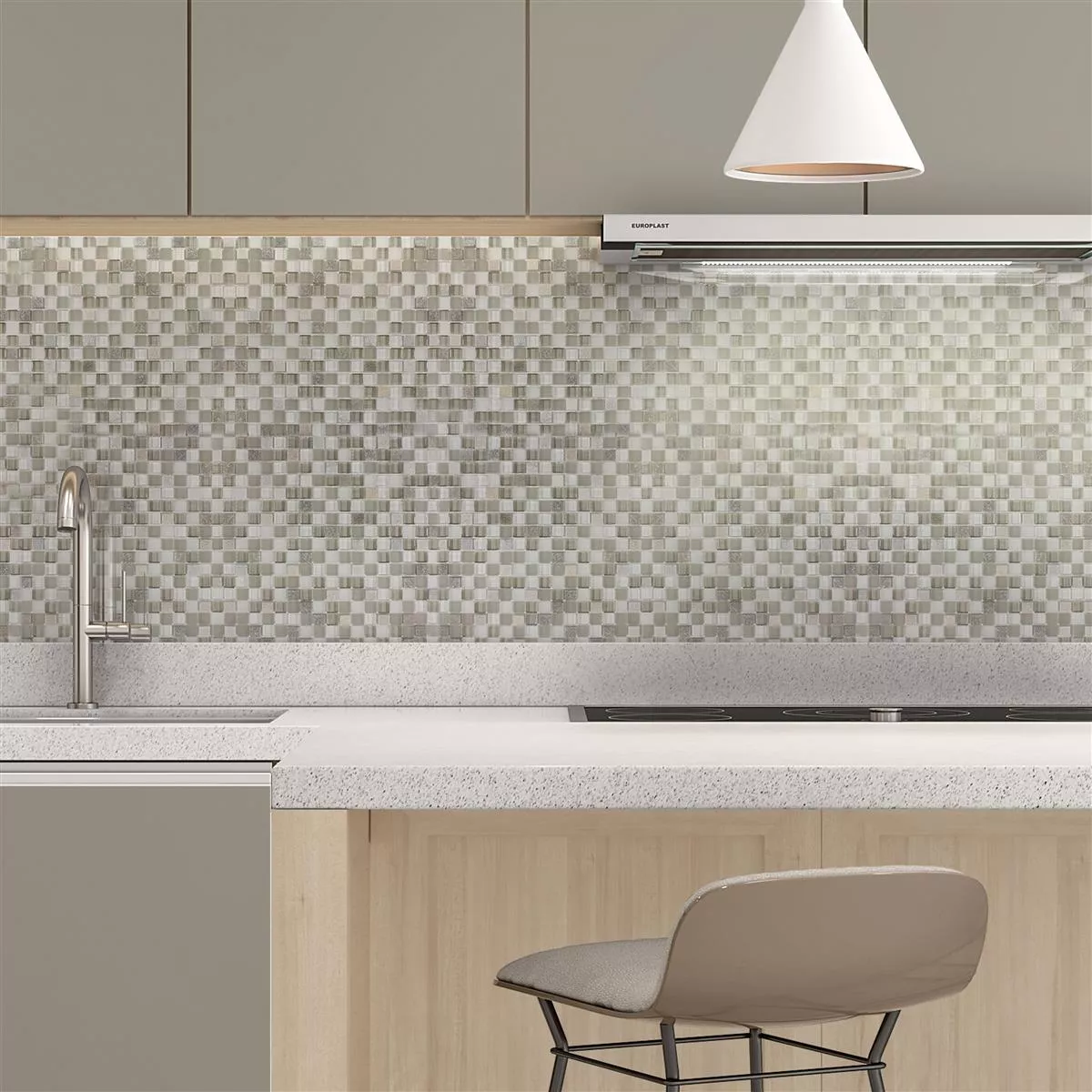 Die Glasmosaik Fliesen Delicias Glas Naturstein Mix bieten eine einzigartige Mischung aus Naturstein und Glas und schaffen damit einen modernen, ansprechenden Look. Die Farben Grau, Beige und Weiß harmonieren perfekt miteinander und können eine sanfte, beruhigende Atmosphäre in jeden Raum bringen. Die Steingröße von 15x15mm verleiht den Fliesen ein schönes Maß an Detail und Textur.