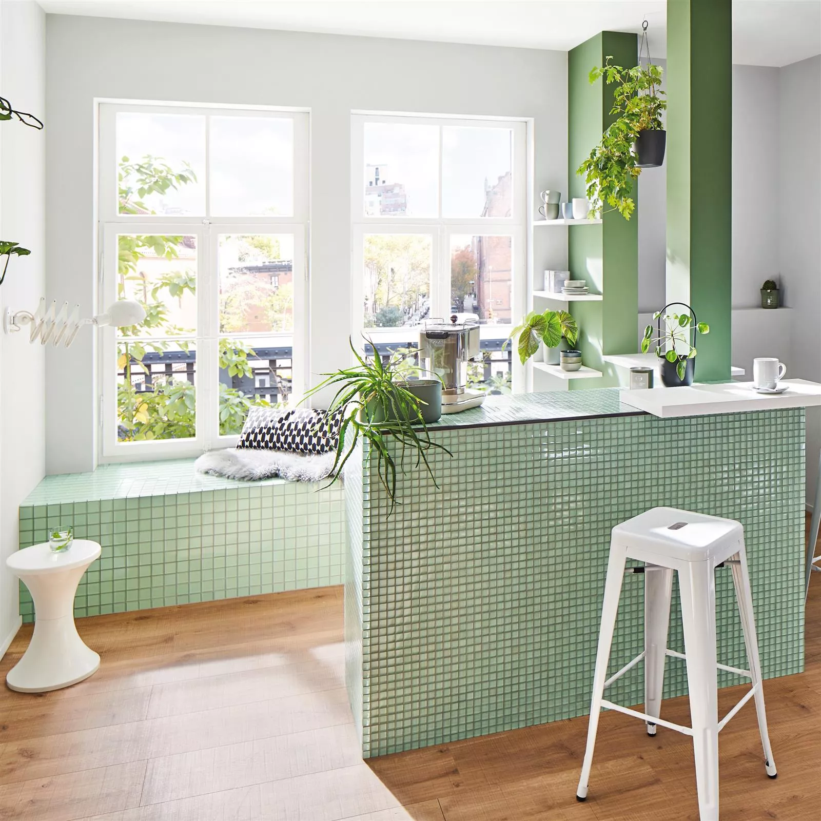 Mit den Glasmosaik Fliesen Destiny Neon kommt ein wundervolles Licht ins Dunkle. Es handelt sich hierbei um selbstleuchtende Fliesen. Tagsüber sind sie Grünblau gehalten oder auch Flaschengrün genannt. In der Nacht leuchten sie gelbgrünlich und bringen ein sanftes Licht in die Räumlichkeit. Die Leuchtkraft der Fliesen hält für mehrere Stunden an, insofern vorher Sonnenlicht oder das Licht einer Lampe an die Fliesen kam.