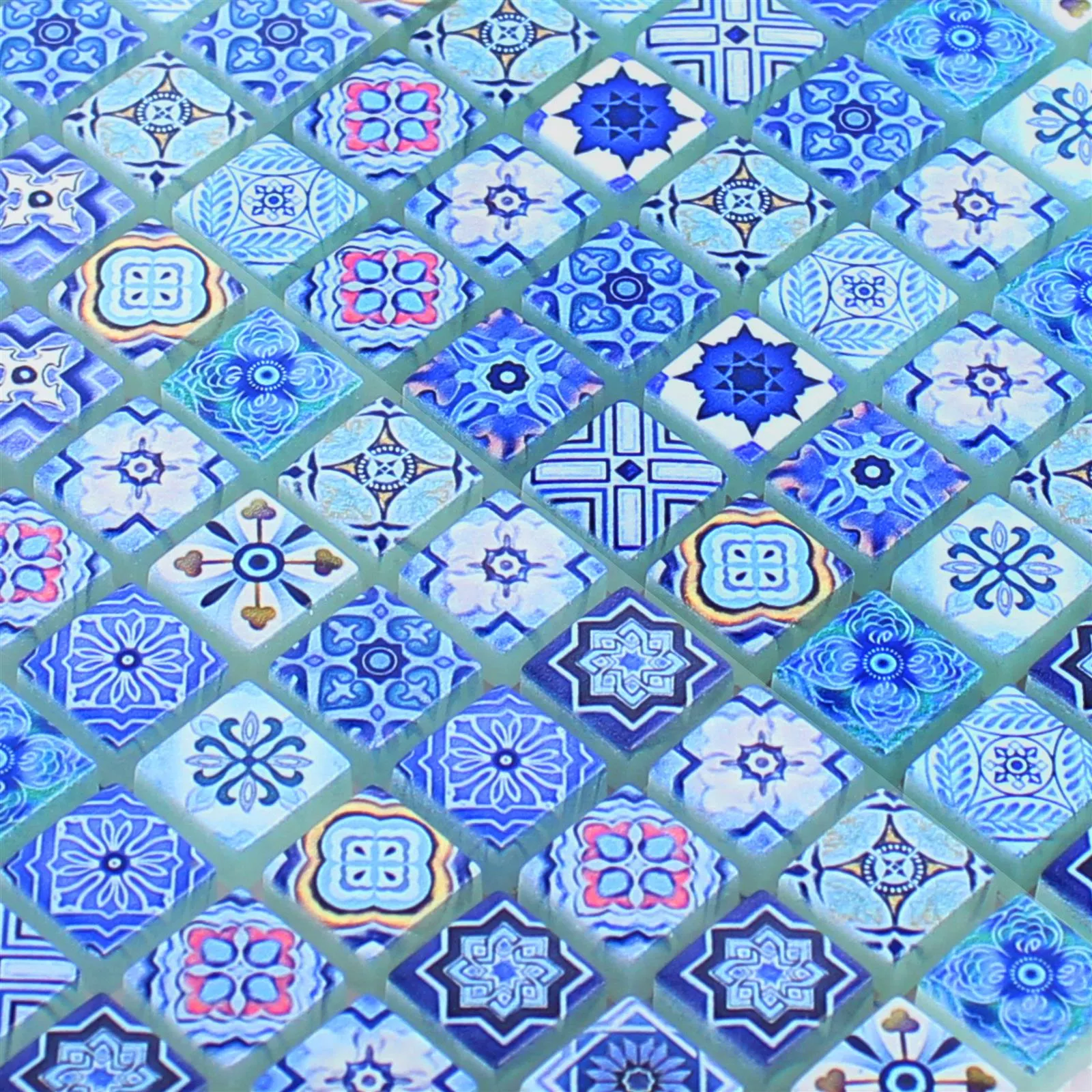 Glasmosaik Fliese Marrakech kombiniert Innovation und Schönheit. Intensives Blau zieht sich durch die schöne Fliese. Mediterrane Muster verleihen Wohn- und Geschäftsräumen ein orientalischen Flair.