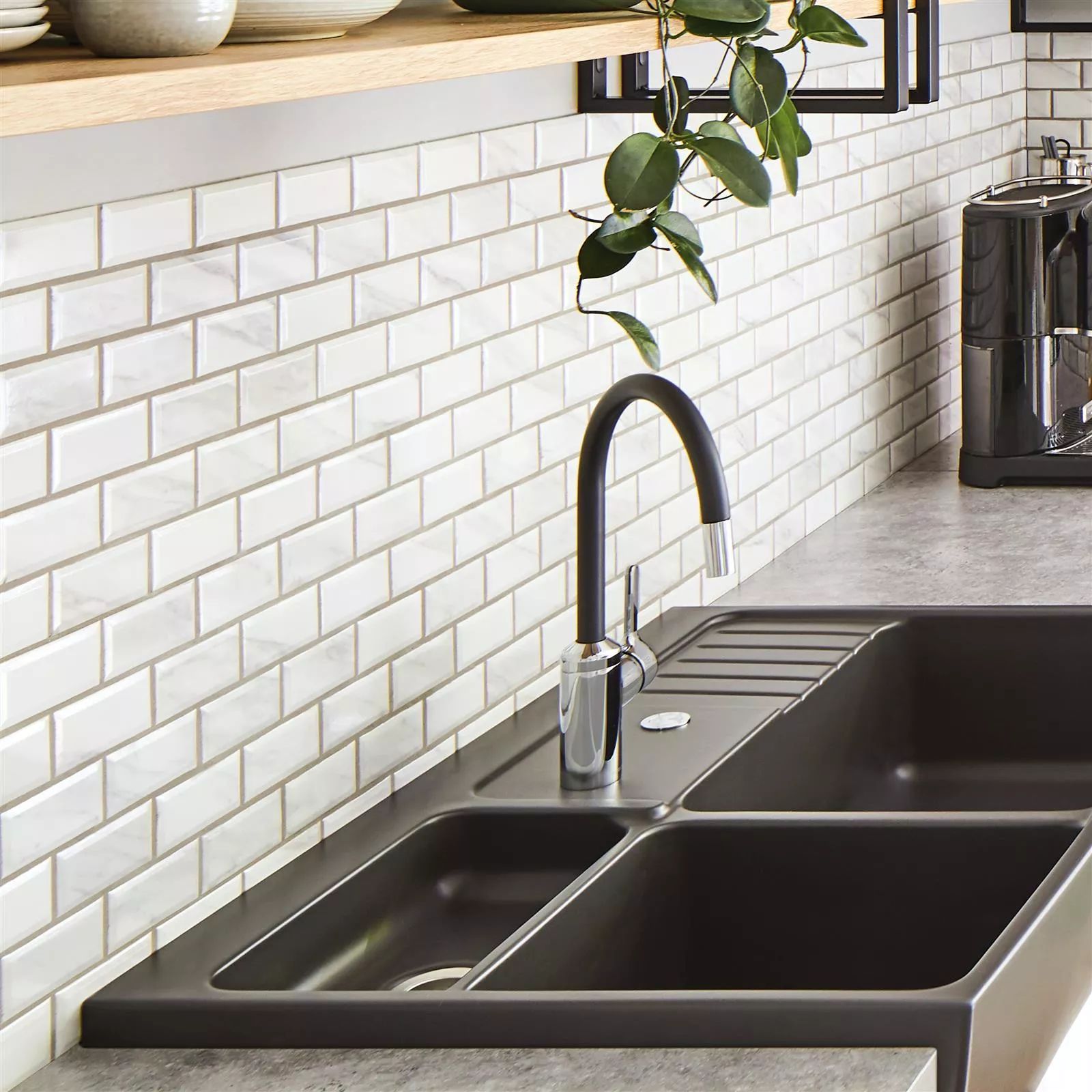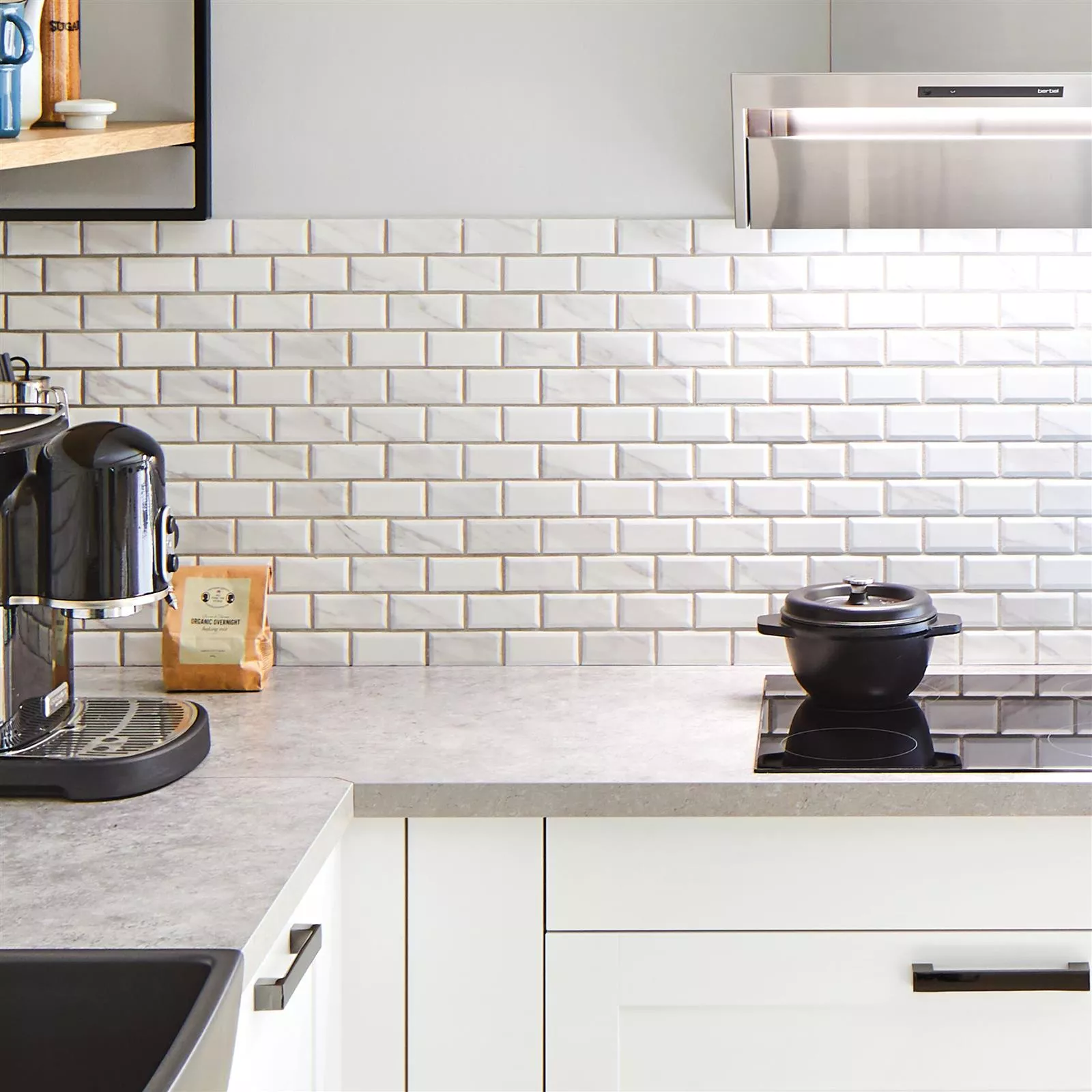 Die Keramik Mosaikfliese Metro Sambucus in der Farbe Carrara weist eine schöne glänzende Oberfläche auf. Die Fliese ist in Weiß gehalten.