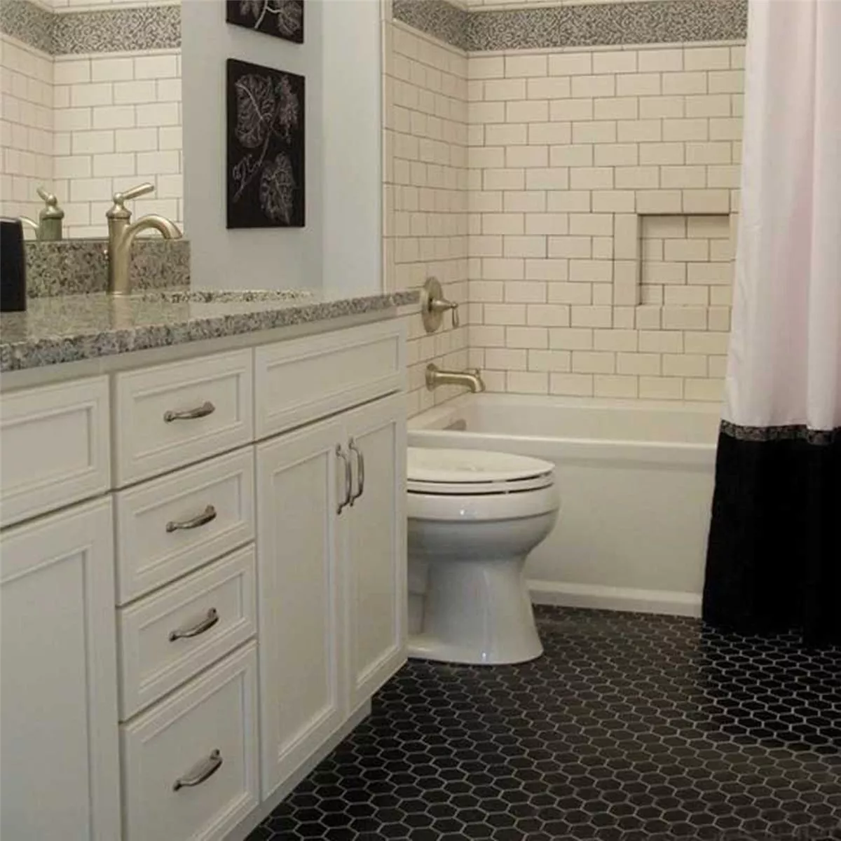 Hexagon Fliesen kommen häufig in Haushaltung zur Gestaltung von WCs, Fluren, Küchen und Badezimmern zum Einsatz. Sie werden zudem für als Wandverkleidung in Brick-Optik gern verlegt. Die Kacheln sind in den Farben Schwarz und Weiß sowie mit matter und glänzender Oberfläche erhältlich. Sie können beispielsweise sehr gut mit Platten in Holzoptik kombiniert werden, beispielsweise hinter einem Kamin.