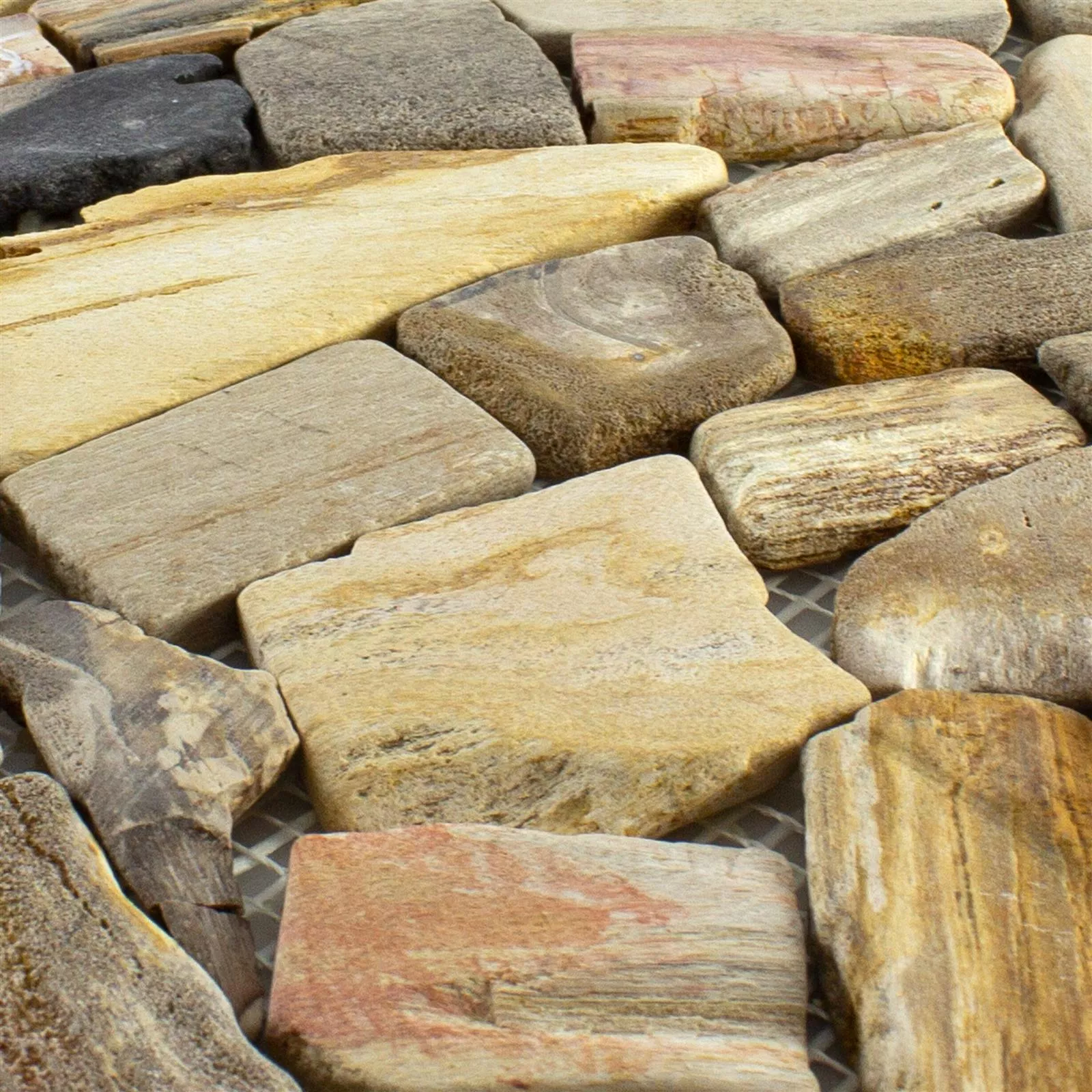 Die Fliesen sind in einem Bruchstein-Format angeordnet und haben eine Holzoptik, die eine warme und natürliche Atmosphäre schafft. Eine Matte hat eine Größe von 30,5x30,5cm und eine Fläche von 0,093m². Diese Mosaikfliesen eignen sich für den Innen- und Außenbereich sowie für Nassbereiche wie Küchen und Bäder.