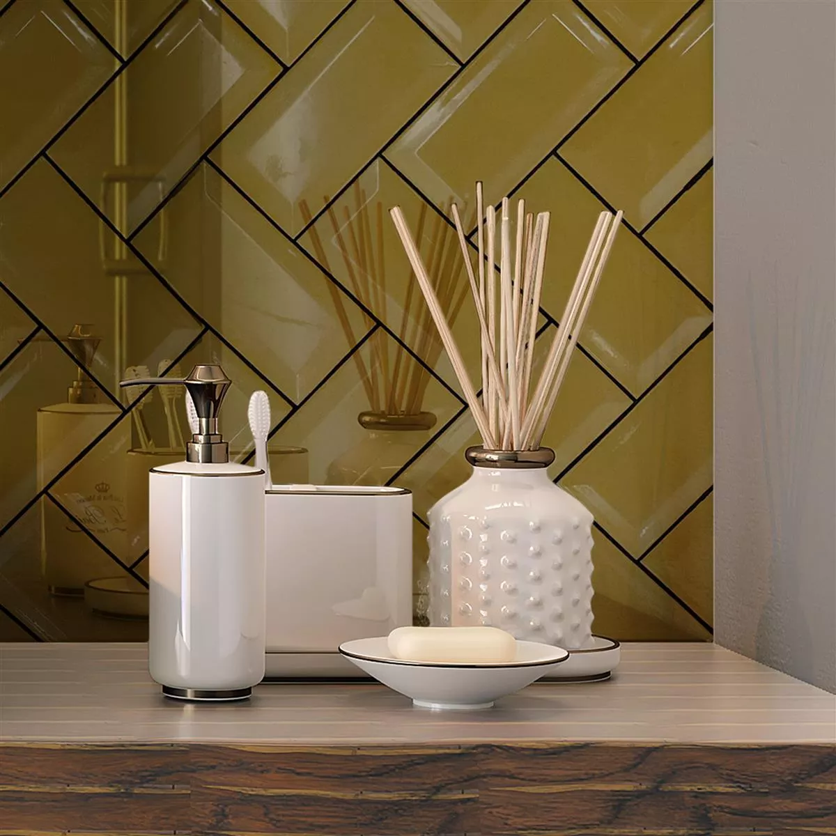 Die Metro Wandfliesen "Heliopolis Facette Gold" verleihen Ihrem Innenraum ein Hauch von Luxus. Das rechteckige Format (7,5x15cm) in glänzendem Gold bringt eine facettenreiche Eleganz in Küche, Bad, Dusche und Wohnraum. Mit einer Stärke von 10mm und der nicht rektifizierten Oberfläche vermitteln diese glasierten Steingutfliesen ein authentisches Metro-Flair.