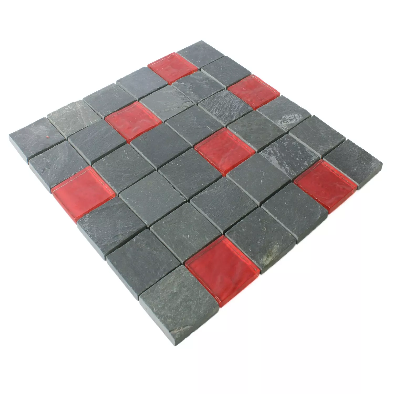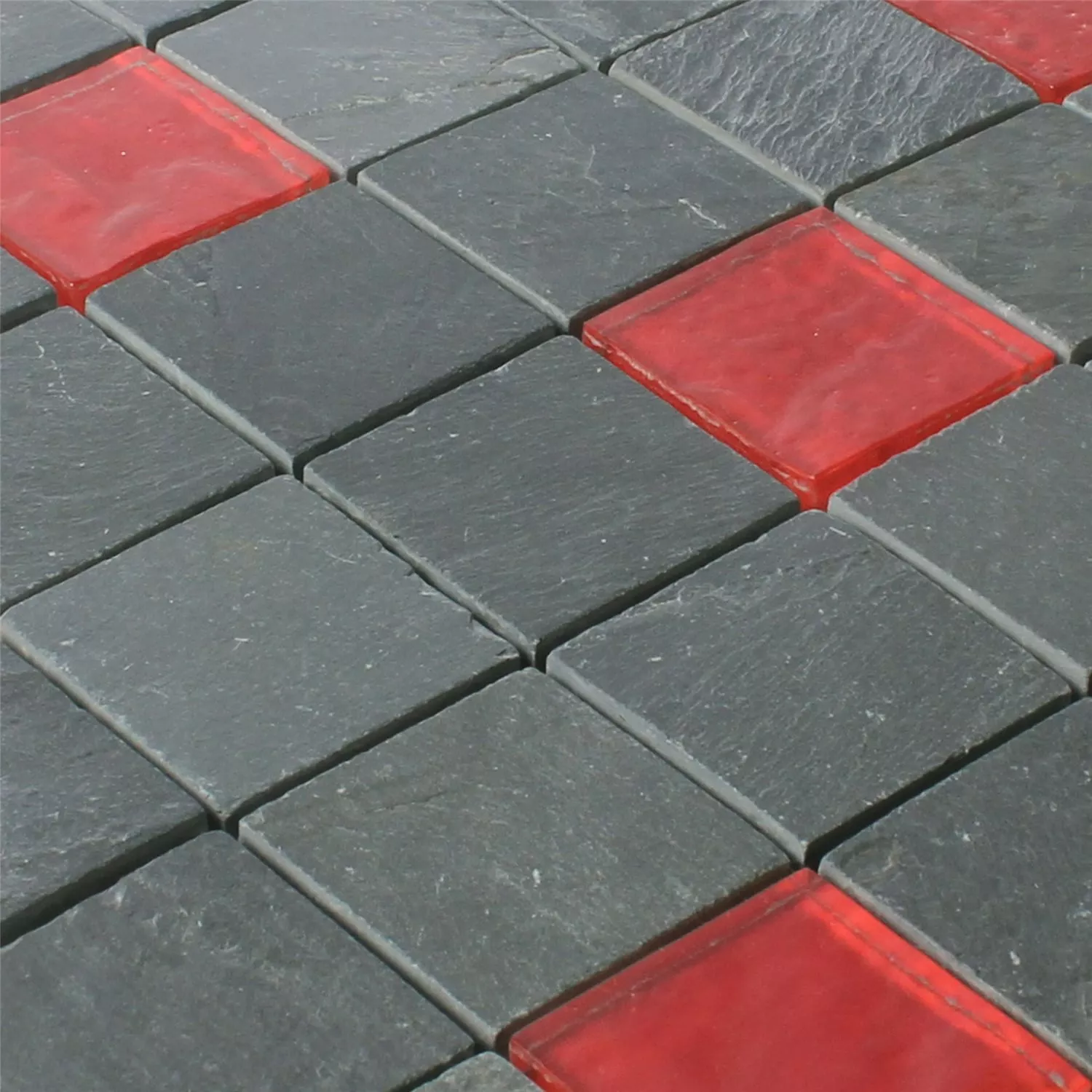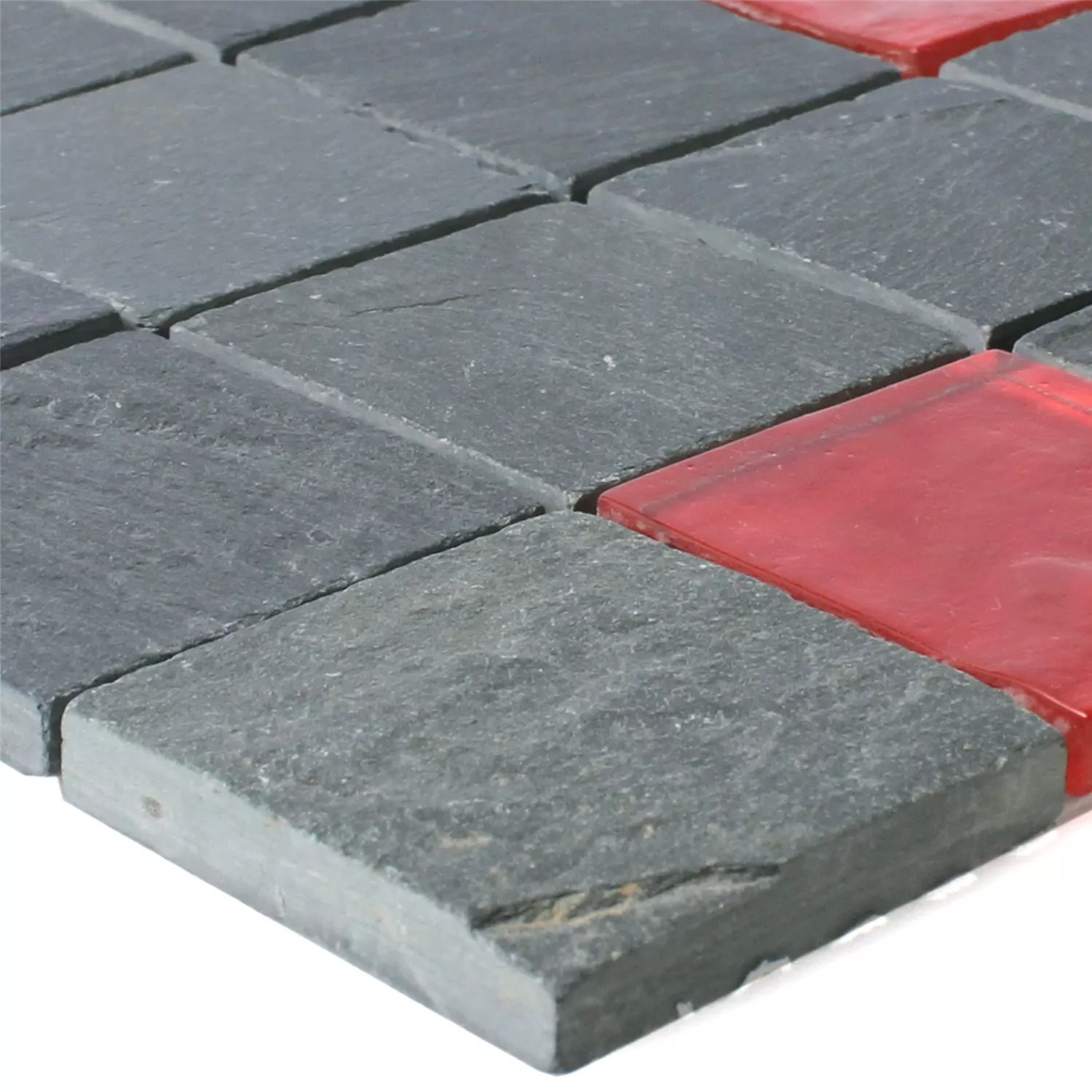 Leben in den Raum zu bringen ist möglich. Die Mosaikfliesen Dragon Schiefer eignen sich dafür hervorragend. Es ist ein Mix aus Schwarz und Rot. Die poppige rote Farbe verleiht der Matte, 30 x30 cm, die richtigen Akzente. Der Materialmix Schiefer und Glas gibt den Mosaikfliesen die nötige Stabilität. Und das obwohl die Dicke nur 8 mm beträgt. Die schwarzen Fliesen sind matt und die roten glänzend. So wirken große Flächen sehr abwechslungsreich und verändern den Raum zum Vorteil.
