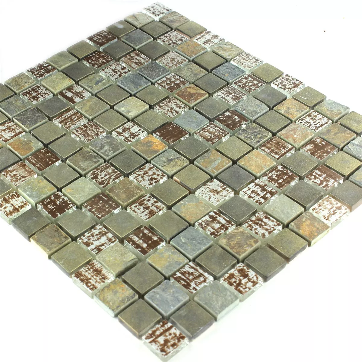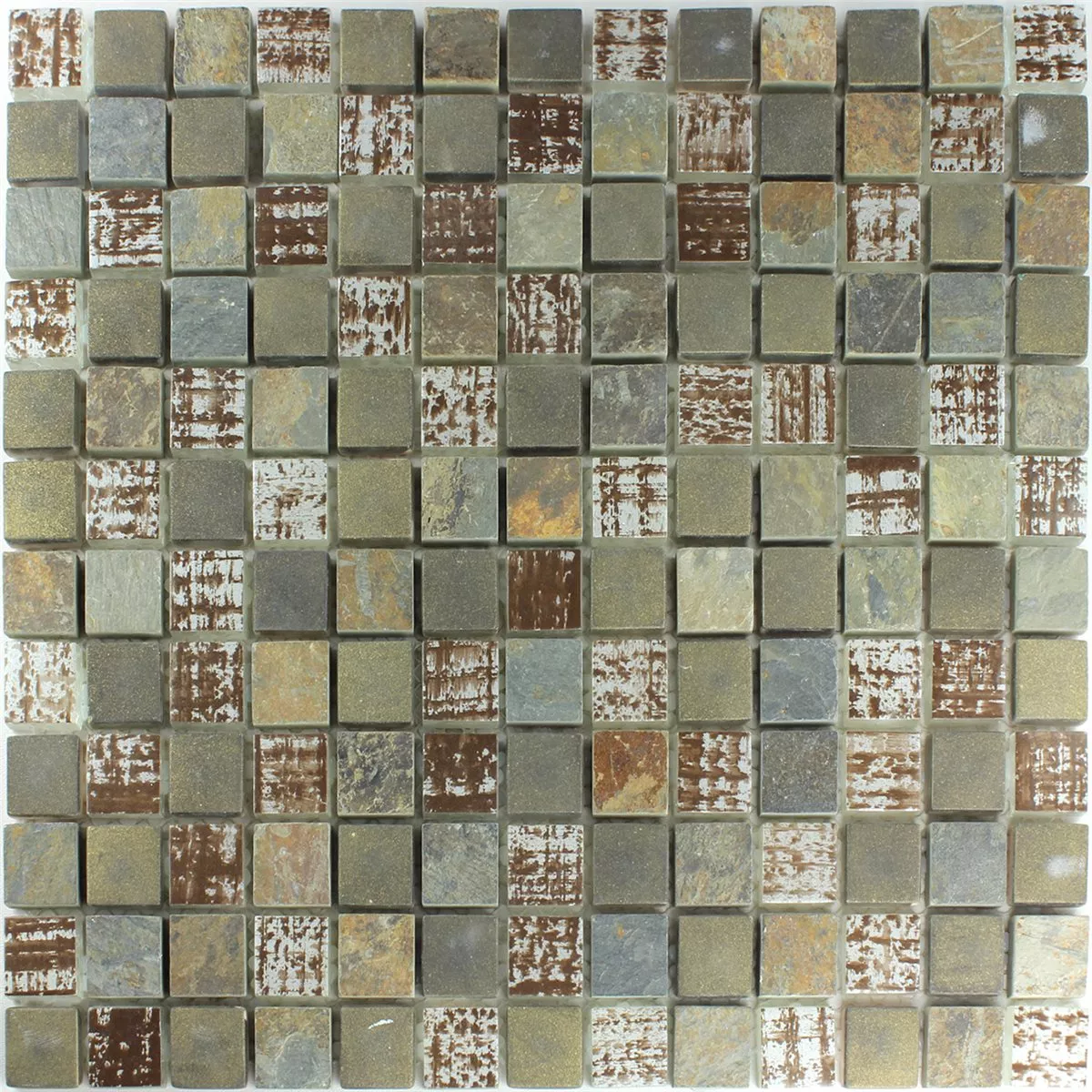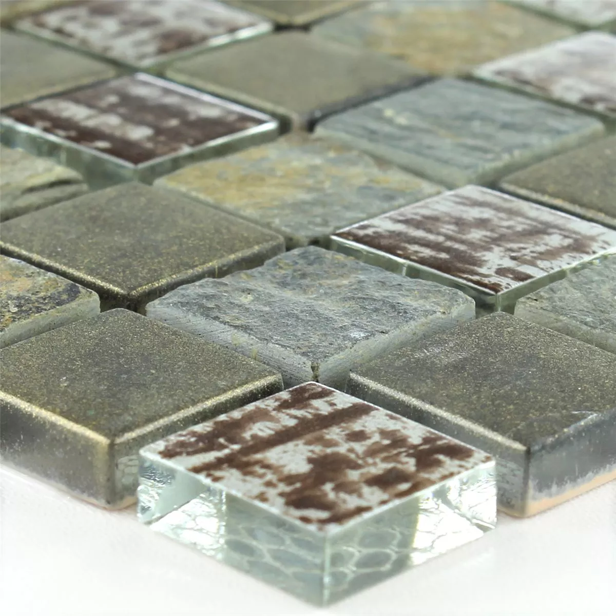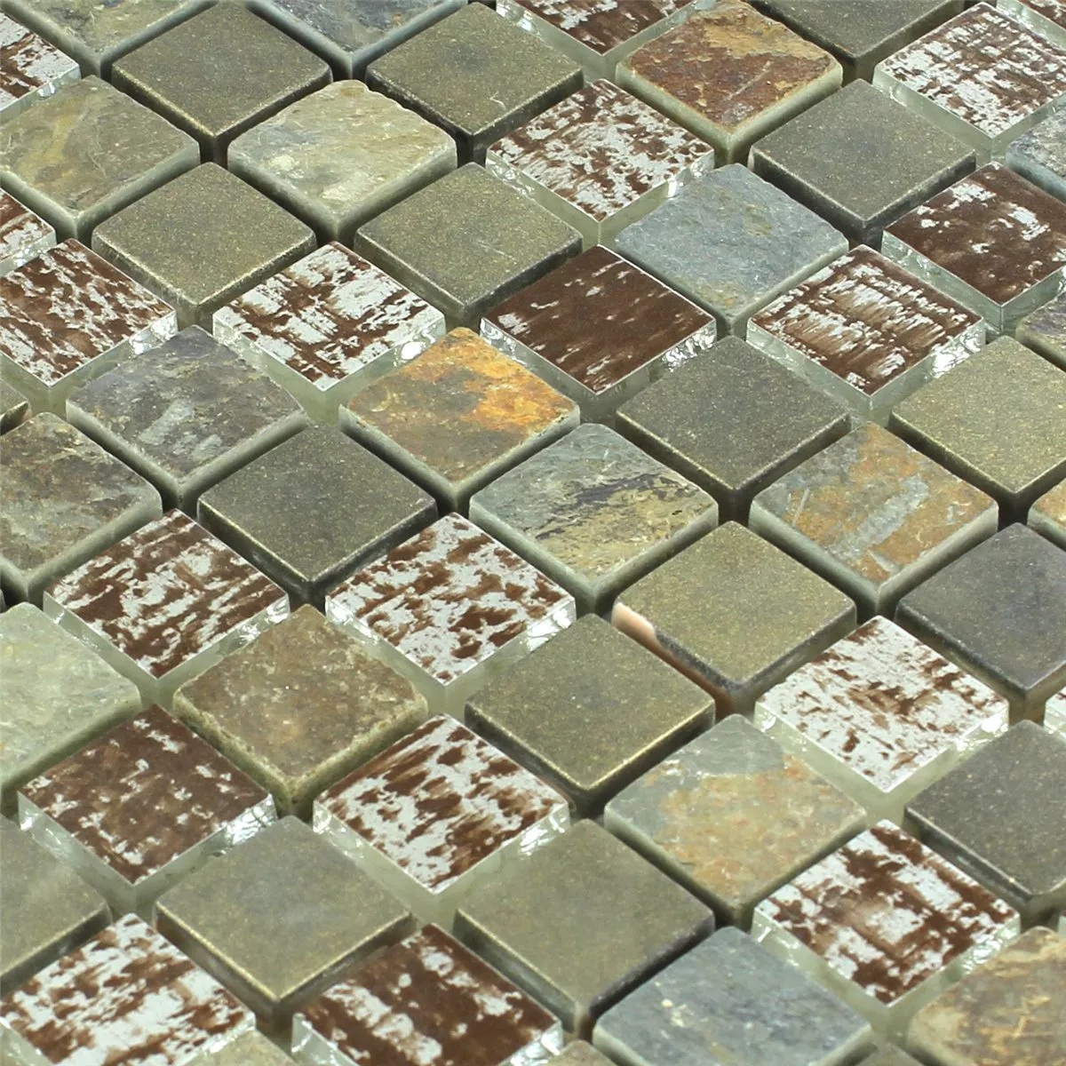 Das Glas Quarzit Naturstein Mosaik in Quadratform ist vielfach verwendbar zur Wandverkleidung, als Bordüre oder zum Setzen von Akzente. Das Quarzitmosaik Glamosaik Mix ist aufgrund seiner hygienischen und leicht zu reinigenden Oberfläche ideal für den gesamten Wohnbereich. Das wechselnde Farbspiel der Steine und die sowohl glänzende als auch matter Oberflächenbeschaffenheit zeichnet dieses Glas Naturstein Quarzit Mosaikfliese aus und neben dem Badbereich findet es in der Sauna, im Schwimmbad und im Wellness Bereich Verwendung. Das Glas Naturstein Quarzit Mosaik in der Farbe braun, rost hat eine Steingröße von 2,3x2,3cm und ein Mattenmaß von 30,5x32,5cm.
