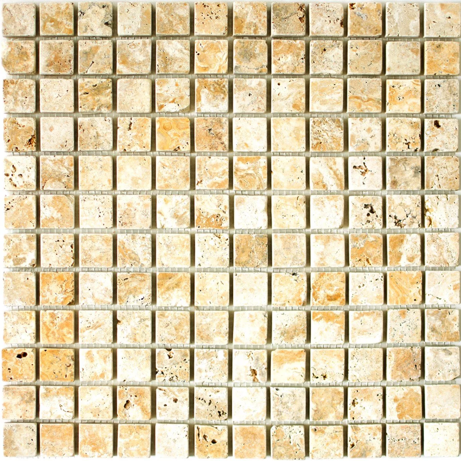Die Mosaikfliesen Travertin Castello Gold 23 sind ein Naturprodukt. Travertin, der Stein aus Tivoli hat einen besonders maritimen Charme und seine porös wirkende Oberfläche macht dieses Naturprodukt so anziehend. Diese Fliesen mit der Bezeichnung Travertin Gold haben auch einen gewissen goldenen Schimmer in der schönen Farbgebung. Es handelt sich um Naturfliesen, die auch mit Natürlichkeit und ihrer belebten Oberfläche wirken.