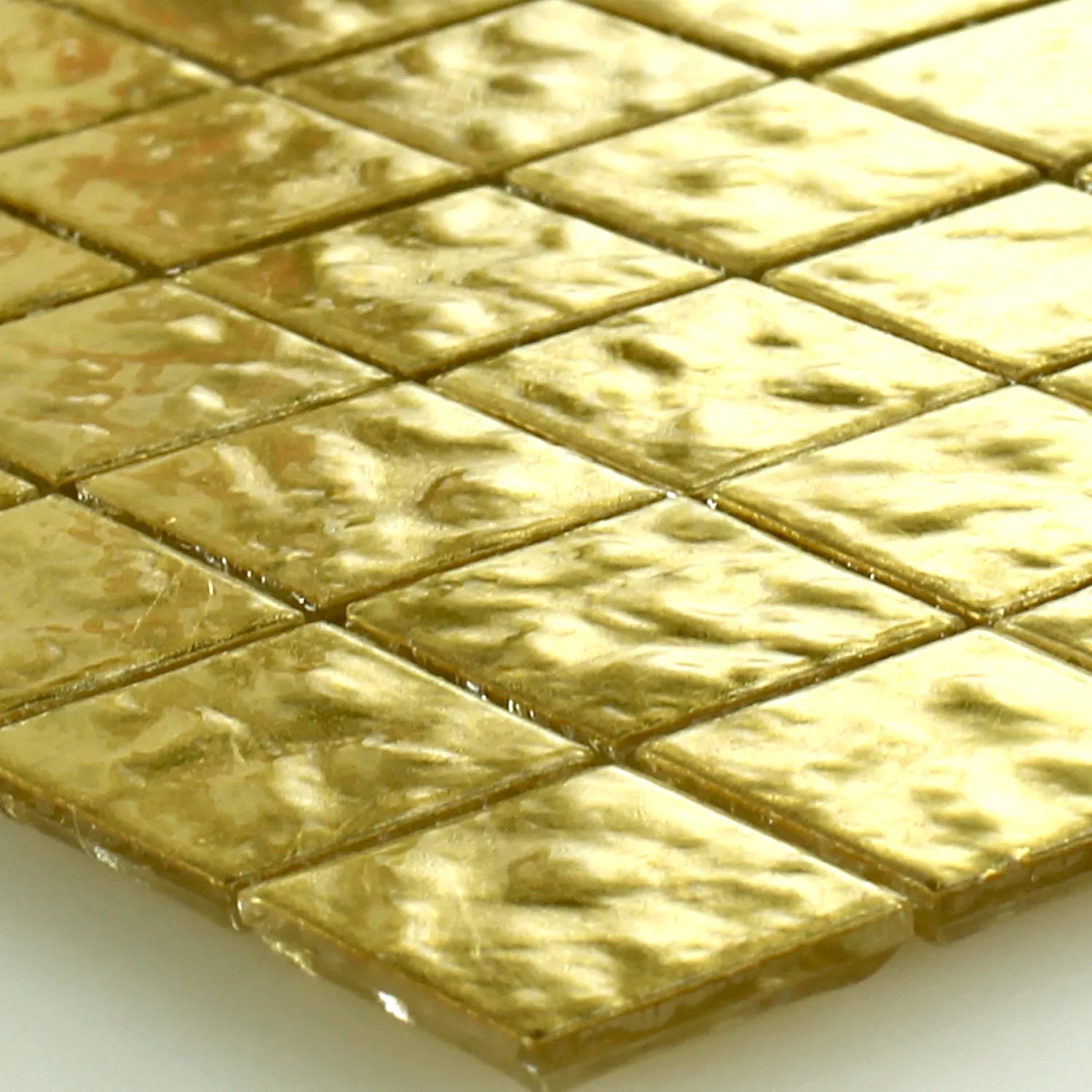 Das Glasmosaik von Trend-Vi ist sowohl mit einer glatten als auch mit einer leicht strukturierten Oberfläche erhältlich. Beide Arten der Mosaikfliesen können auch als Glasmosaik miteinander kombiniert werden, so dass in jedem Raum eine individuelle Atmosphäre gestalten werden kann. Die 24 Karat Blatt Gold Fliesen aus dem berühmten Haus Trend-Vi sind aber nicht nur für private Räume eine gute Wahl. Diese exklusiv gestalteten kleinen Fliesen sind auch bestens für öffentliche Räume geeignet, in denen Publikum verkehrt. Sowohl in einem Lokal als auch in einer Bar oder sogar in einer exklusiven Praxis schaffen diese goldfarbenen Mosaikfliesen mit dem transparenten Glasschimmer eine gemütliche Atmosphäre. Ein feines Glasmosaik aus den trendigen Mosaikfliesen ergänzt jeden modernen und jeden traditionellen Wohn- und Einrichtungsstil.