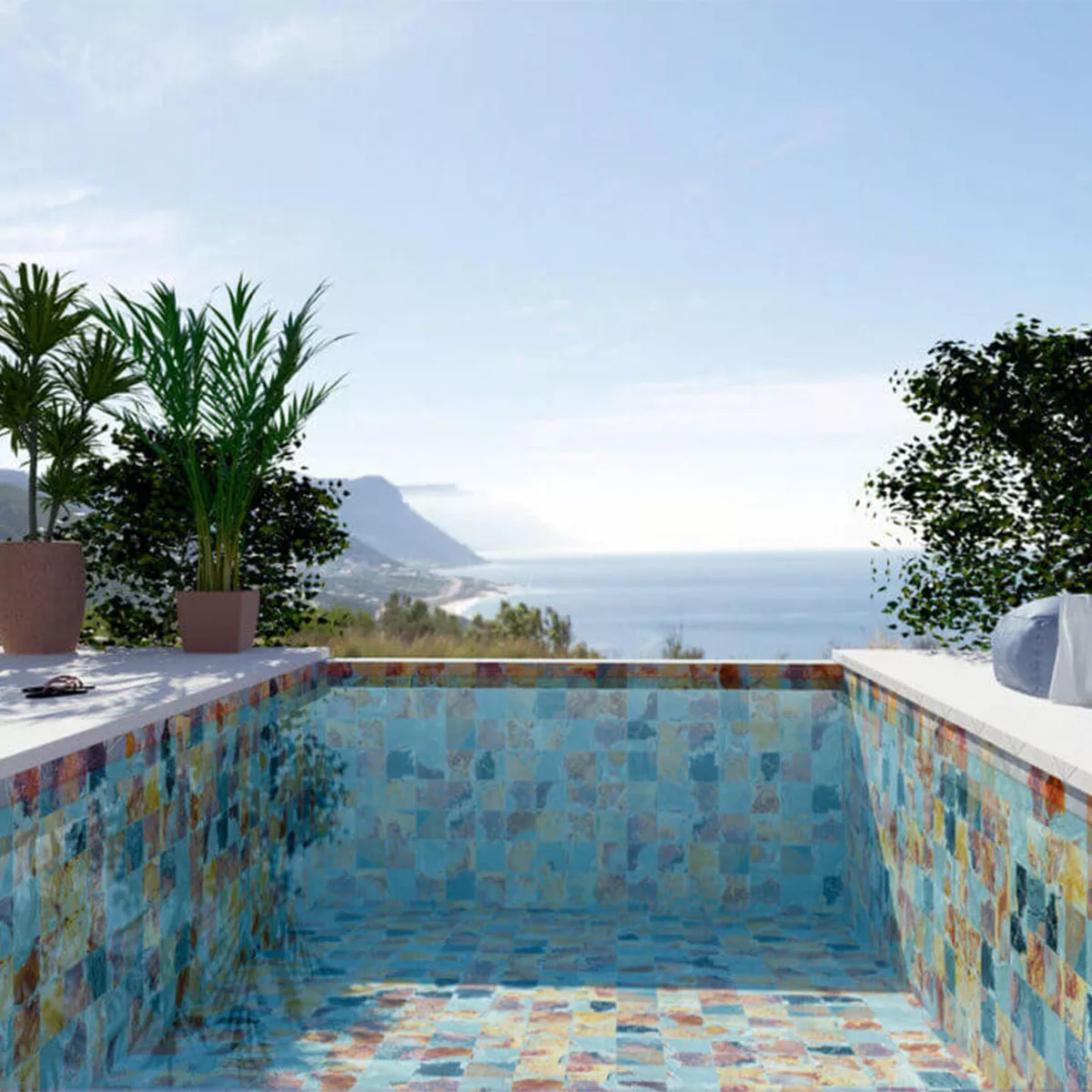 - In und um Schwimmbäder, wo die Fliesen kontinuierlicher Feuchtigkeit ausgesetzt sind, bieten sie die notwendige Beständigkeit.