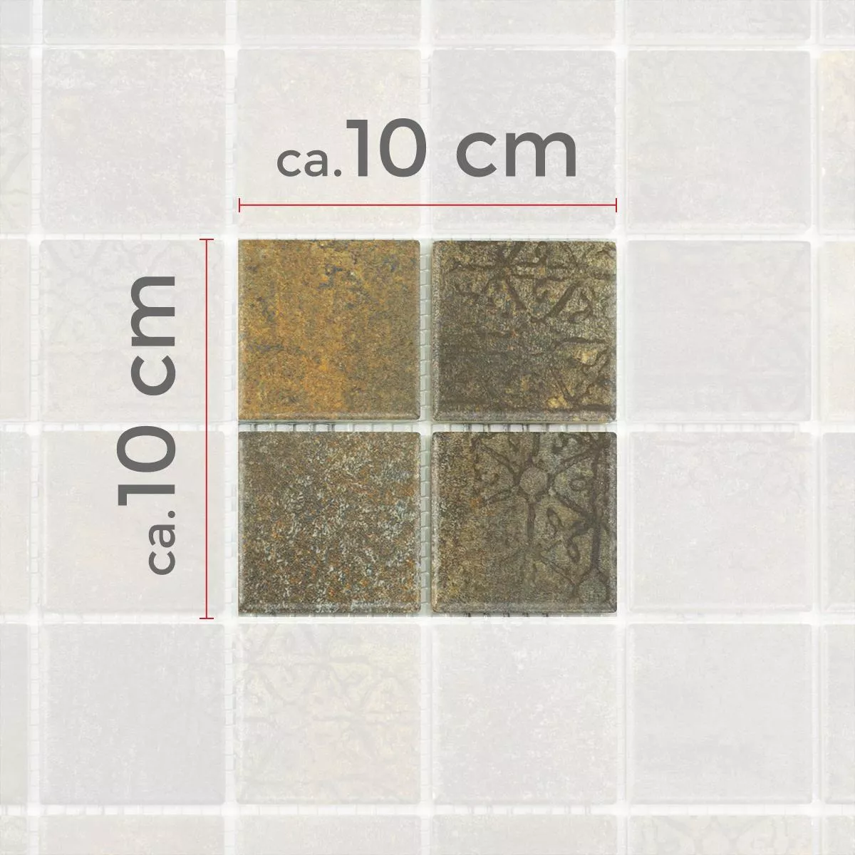Jede Fliese und jedes Mosaik haben aufgrund individueller Materialeigenschaften und Anwendungsbedingungen unterschiedliche Anforderungen an das Zuschneiden, Verlegen und Verarbeiten. Fragen Sie einen örtlichen Experten für das korrekte und sichere Verlegen Ihrer Mosaike oder Fliesen. Wir haften nicht für unsachgemäßen Gebrauch und fehlerhafte Verarbeitung von Baumaterialien.