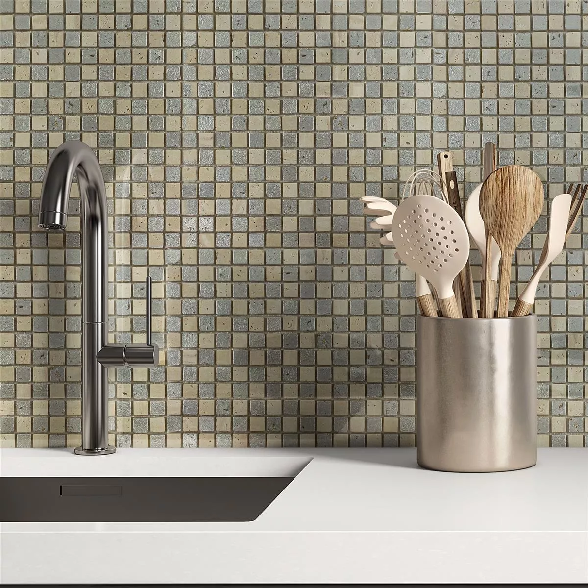 Jede Fliese und jedes Mosaik haben aufgrund individueller Materialeigenschaften und Anwendungsbedingungen unterschiedliche Anforderungen an das Zuschneiden, Verlegen und Verarbeiten. Fragen Sie einen örtlichen Experten für das korrekte und sichere Verlegen Ihrer Mosaike oder Fliesen. Wir haften nicht für unsachgemäßen Gebrauch und fehlerhafte Verarbeitung von Baumaterialien.