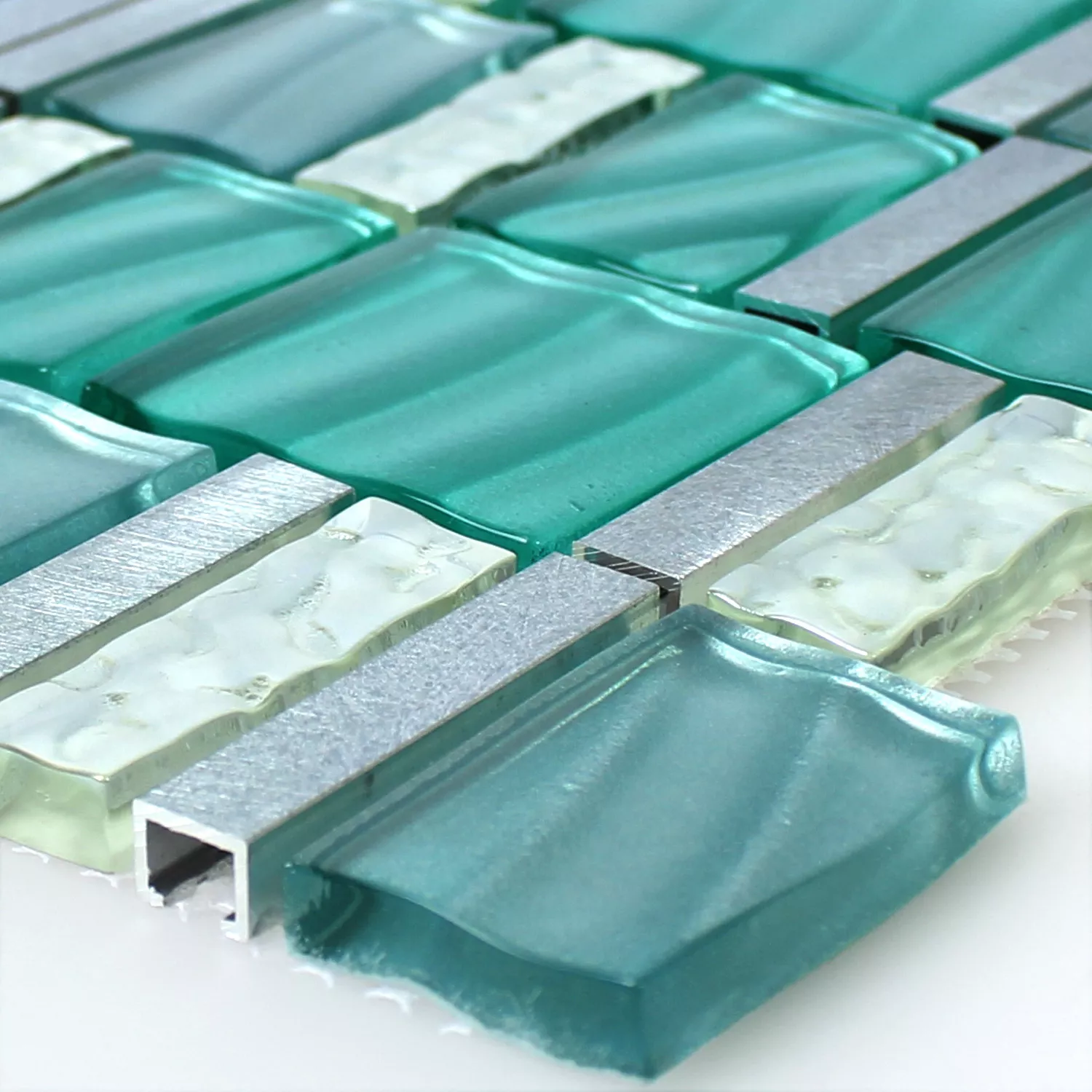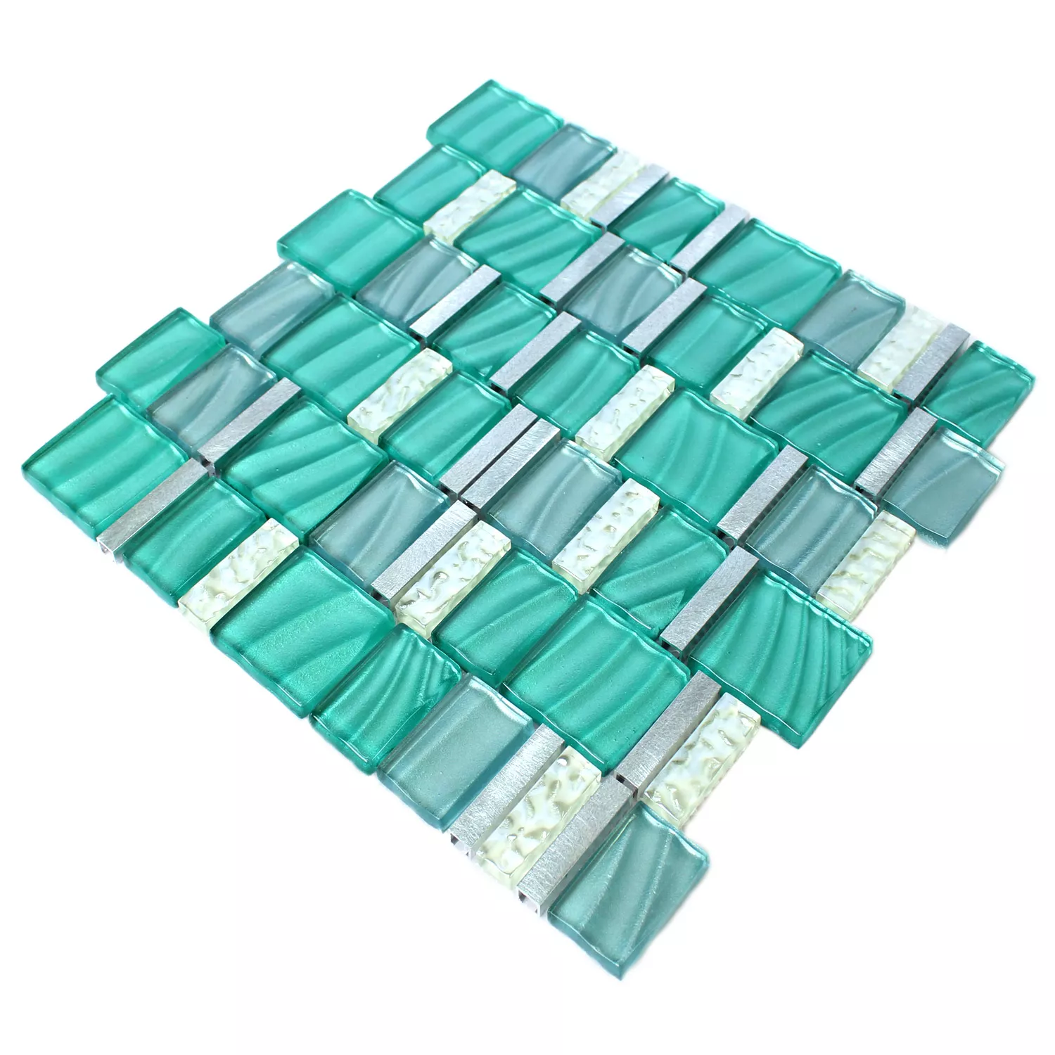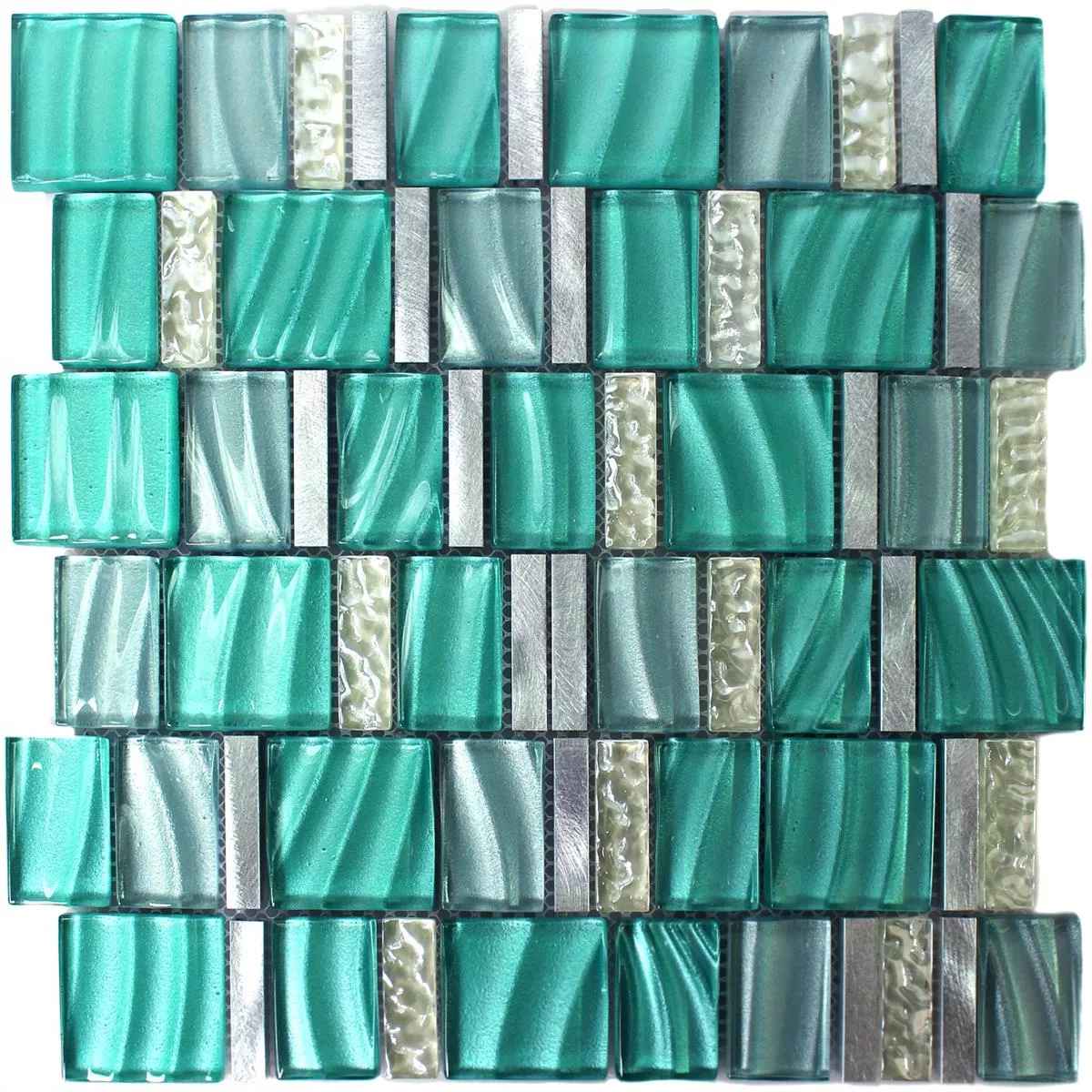 Muster von Mosaikfliesen Glas Aluminium Grün Silber Mix