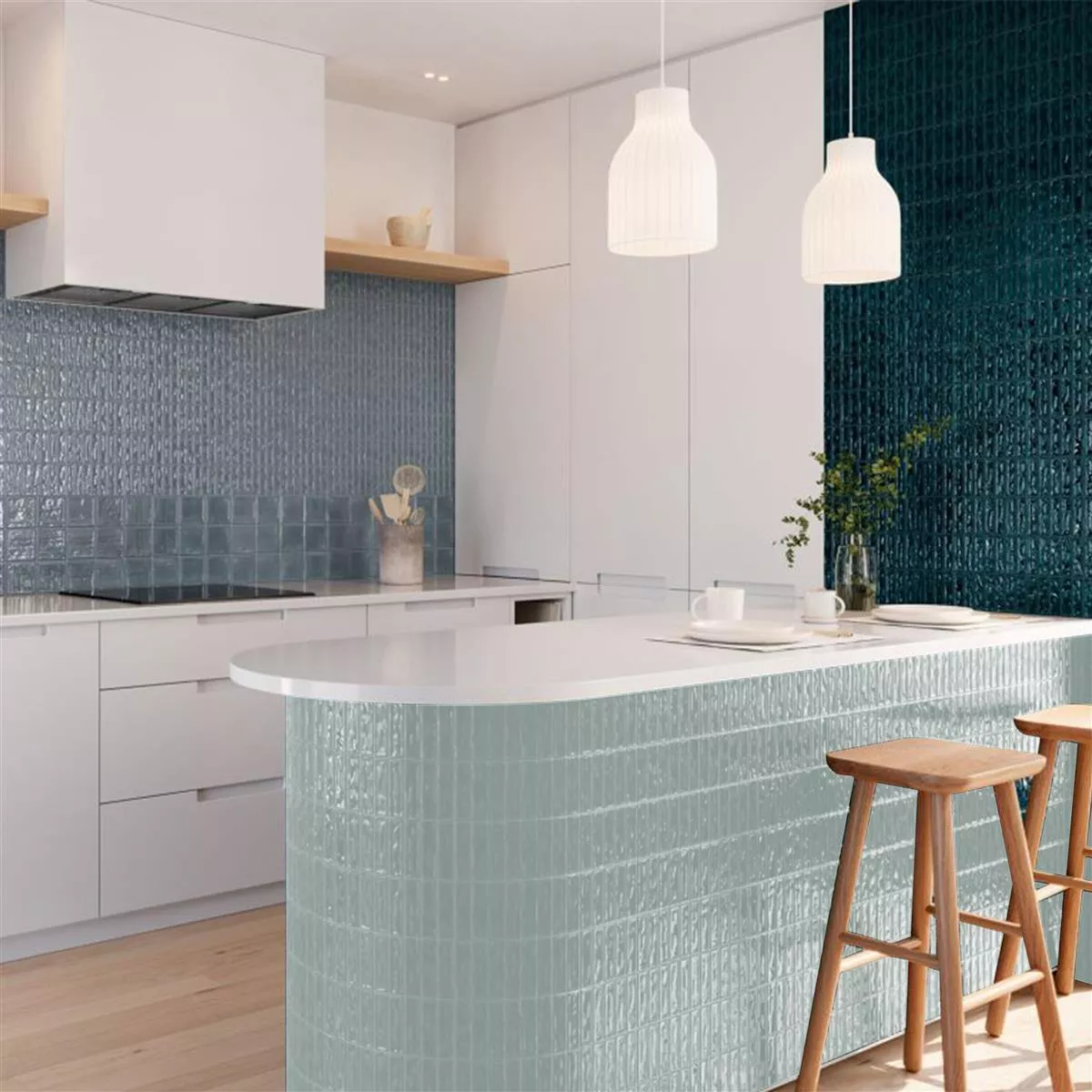 Muster von Wandfliesen Verbania Stäbchen Glänzend Gewellt Türkis 20x20cm