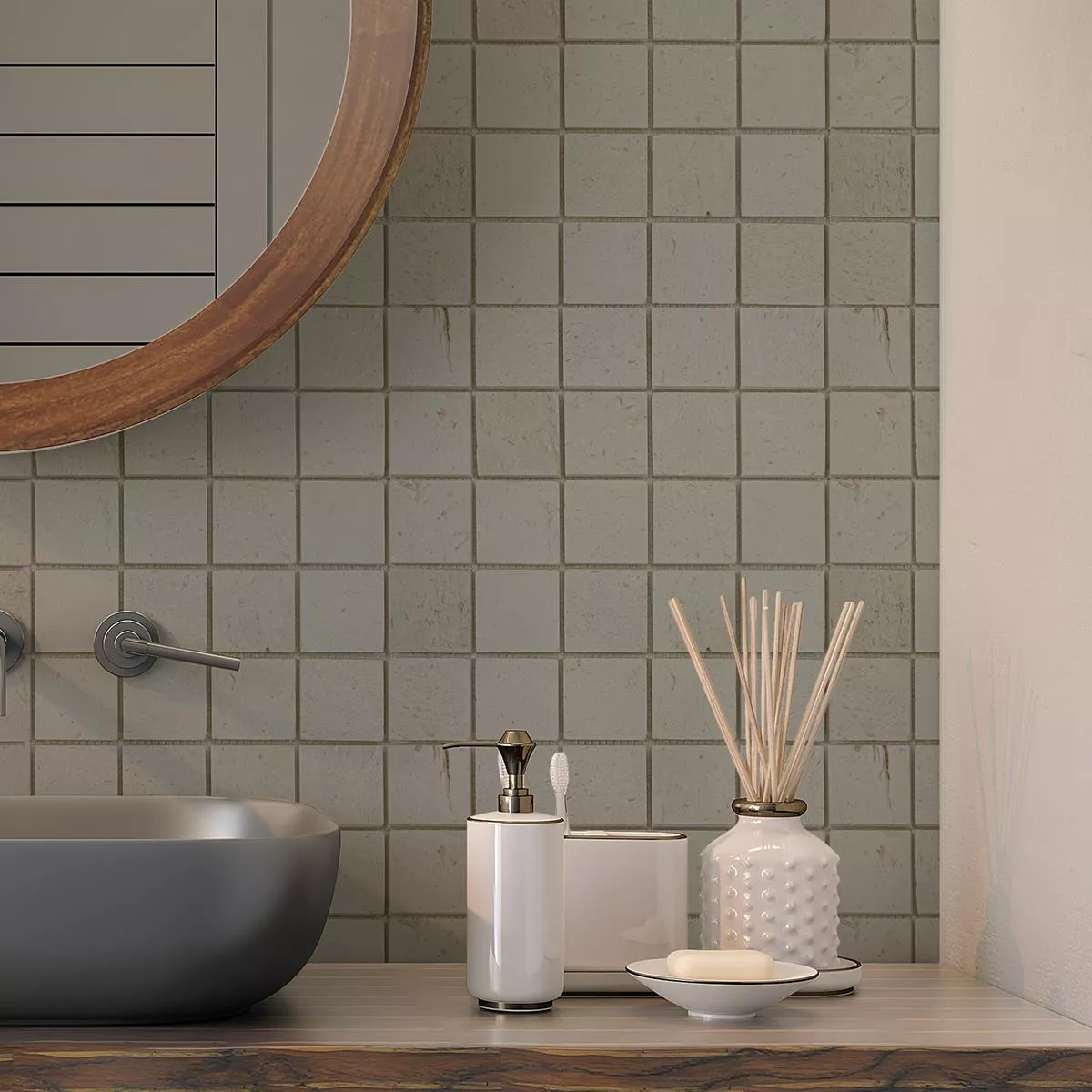 Jede Fliese und jedes Mosaik haben aufgrund individueller Materialeigenschaften und Anwendungsbedingungen unterschiedliche Anforderungen an das Zuschneiden, Verlegen und Verarbeiten. Fragen Sie einen örtlichen Experten für das korrekte und sichere Verlegen Ihrer Mosaike oder Fliesen. Wir haften nicht für unsachgemäßen Gebrauch und fehlerhafte Verarbeitung von Baumaterialien.