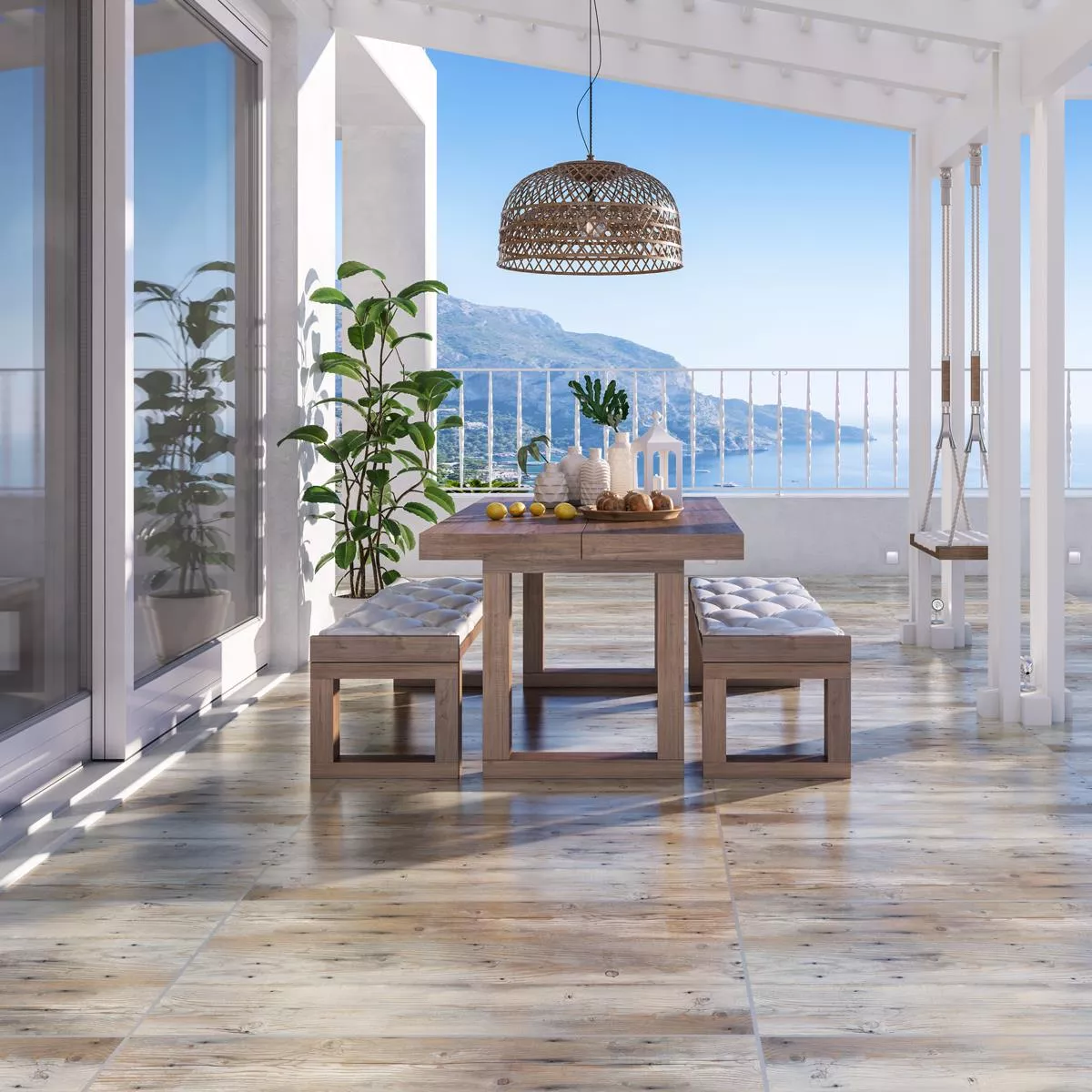 Diese Platten bestehen aus hochwertigem Feinsteinzeug, das für seine Haltbarkeit und Widerstandsfähigkeit bekannt ist. Die matte, glasierte Oberfläche sorgt für eine authentische Holzoptik, die sowohl im Innen- als auch im Außenbereich hervorragend zur Geltung kommt. Die Abriebfestigkeit (Abriebklasse 4) und die Rutschhemmung von R10 machen diese Fliesen besonders sicher und langlebig.