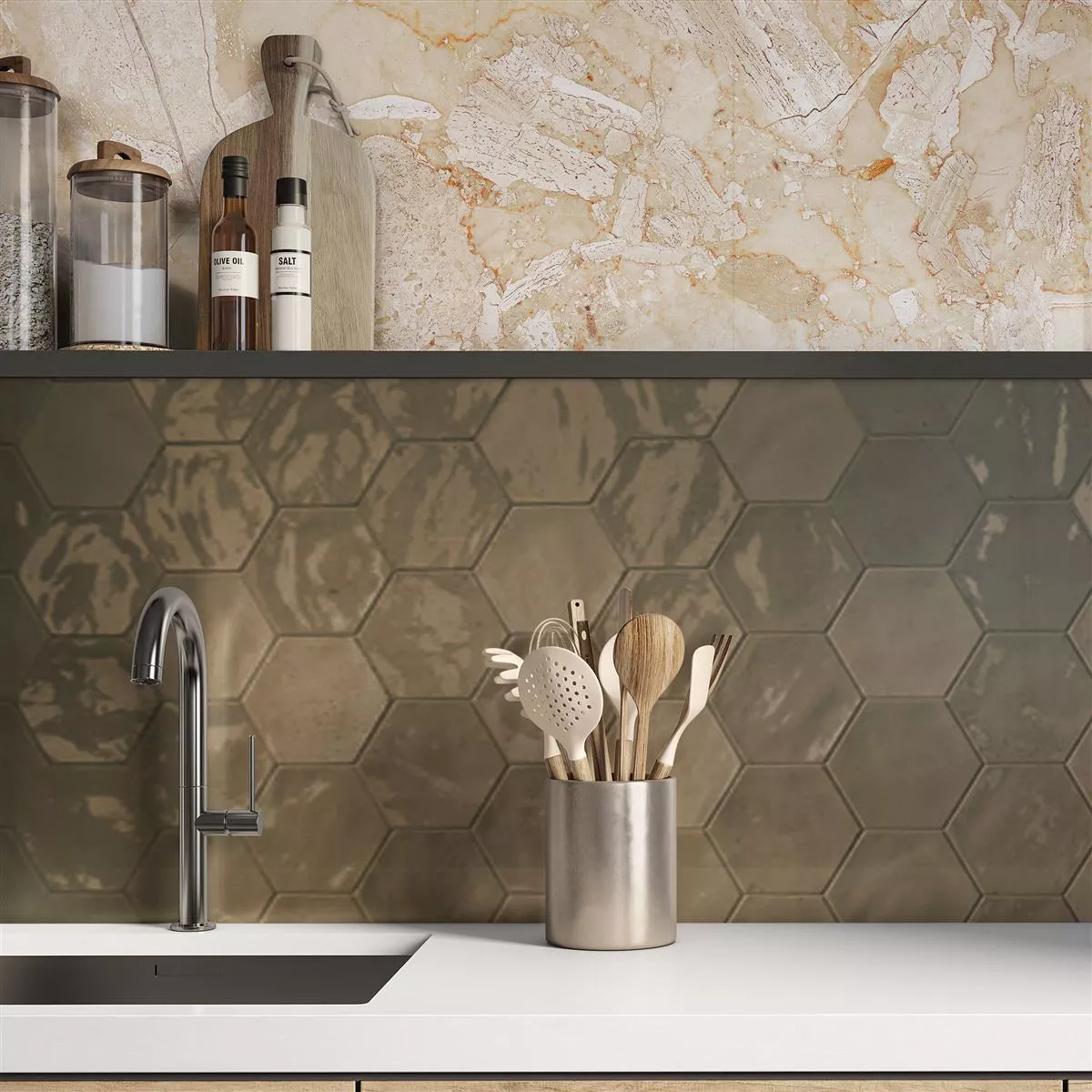 Die Wandfliesen Arosa Glänzend Gewellt Hexagon in einem warmen Braunton sind eine verlockende und vielseitige Wahl für die Gestaltung Ihrer Räumlichkeiten. Gefertigt aus hochwertigem Steingut präsentieren diese Fliesen eine glänzende, gewellte Oberfläche, die nicht nur einen bezaubernden vintage-inspirierten Look verleiht, sondern auch einen Hauch von Eleganz und Wärme in Ihr Zuhause bringt.