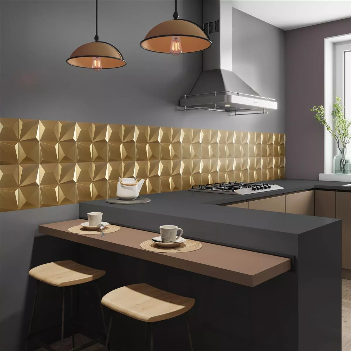 Die Wandfliesen "Skyline 3D Mix Matt Gold" verleihen Ihren Innenräumen einen Hauch von Luxus. In einem Paket mit 0,50m² bieten diese quadratischen Fliesen (25x25cm) eine goldene matte, glasierte Oberfläche mit einem faszinierenden 3D-Effekt. Mit einem Gewicht von 9,8 kg und einer Stärke von 9mm sind sie nicht nur stilvoll, sondern auch robust und leicht zu handhaben.